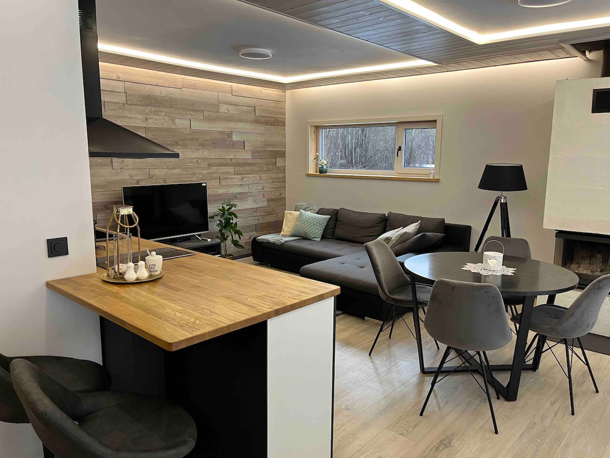 Relájate y desconecta en este alojamiento tranquilo y elegante. Perfecto para unas vacaciones tranquilas en la naturaleza. Pequeña casa de dos plantas de 40 m2 y una casa de sauna independiente con todo lo necesario para una escapada corta o larga: cocina totalmente equipada, wifi, TV, pequeño espacio de trabajo, sauna relajante y acogedores espacios relajantes.