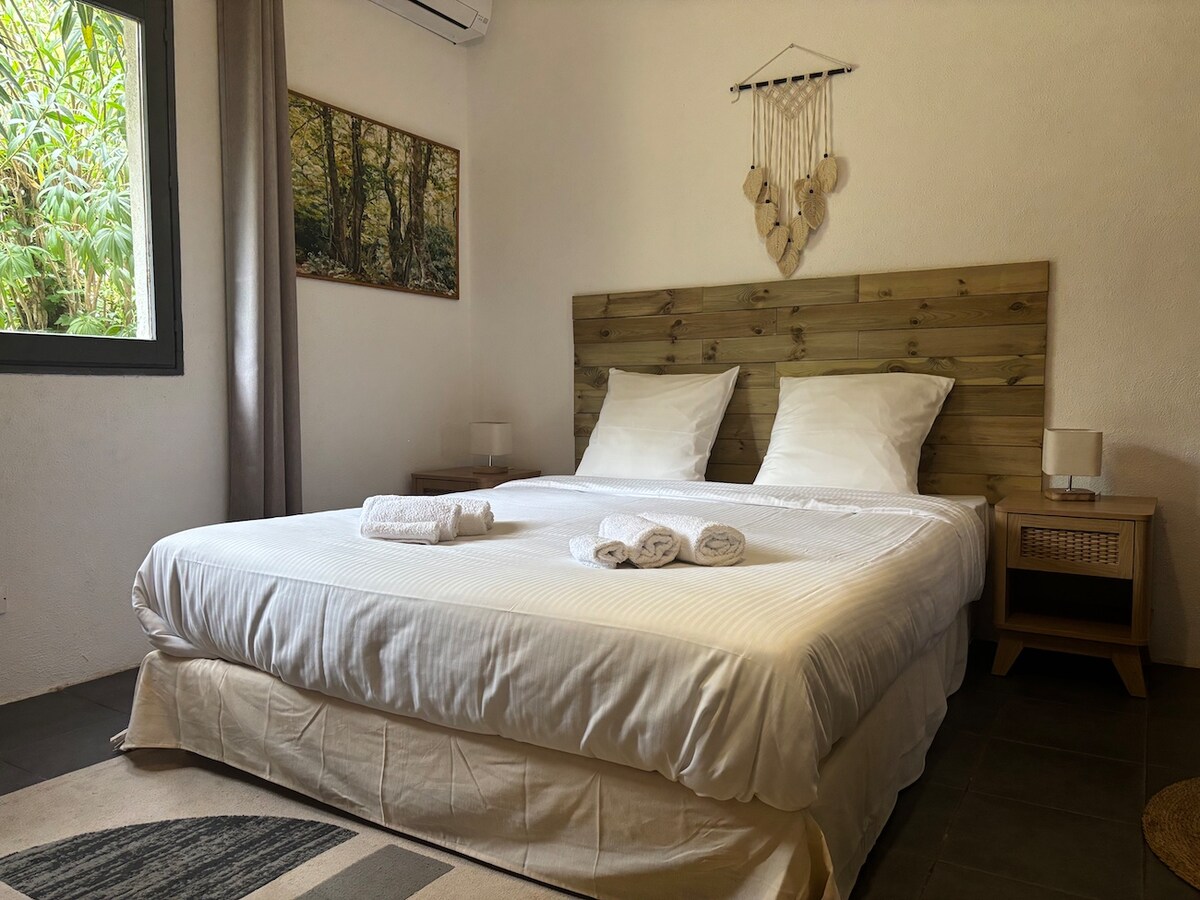 Welcome to our charming, minimalist-style studio, ideally just 900 m from the beach with a beautiful mountain view. Caro and Simon, a French-English speaking couple, will warmly welcome you and ensure a pleasant stay. Spacious and bright, the studio includes a fully equipped kitchenette, a modern bathroom with shower, an indoor dining area, and a large private terrace to relax to the sound of cicadas. High-quality bedding, double or twin beds. Ideal for a peaceful stay between sea and nature.