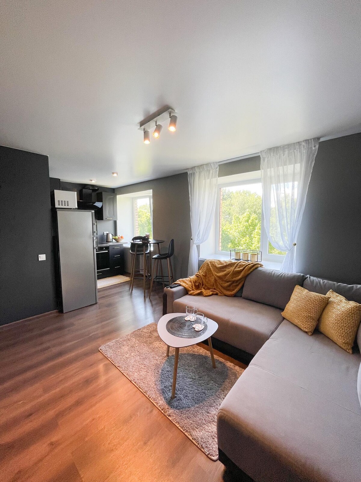 El apartamento tiene un amplio diseño con todo lo que necesitas: en la cocina, una técnica para cocinar y vajilla, una cafetera cápsula + cápsulas de café, un hervidor eléctrico y un microondas. Un sofá cama que se despliega en la sala de estar, un televisor de 55pulgadas e internet. El dormitorio es una habitación privada con armario y cortinas opacas. El apartamento está equipado con lavadora, secador de ropa, secador de pelo y aspiradora. El departamento está en una subdivisión tranquila, a poca distancia a pie del centro comercial, cine, tiendas de comestibles. Aparcamiento gratuito y vigilancia con cámara frente a la casa Estación de autobuses a 1,5 km
