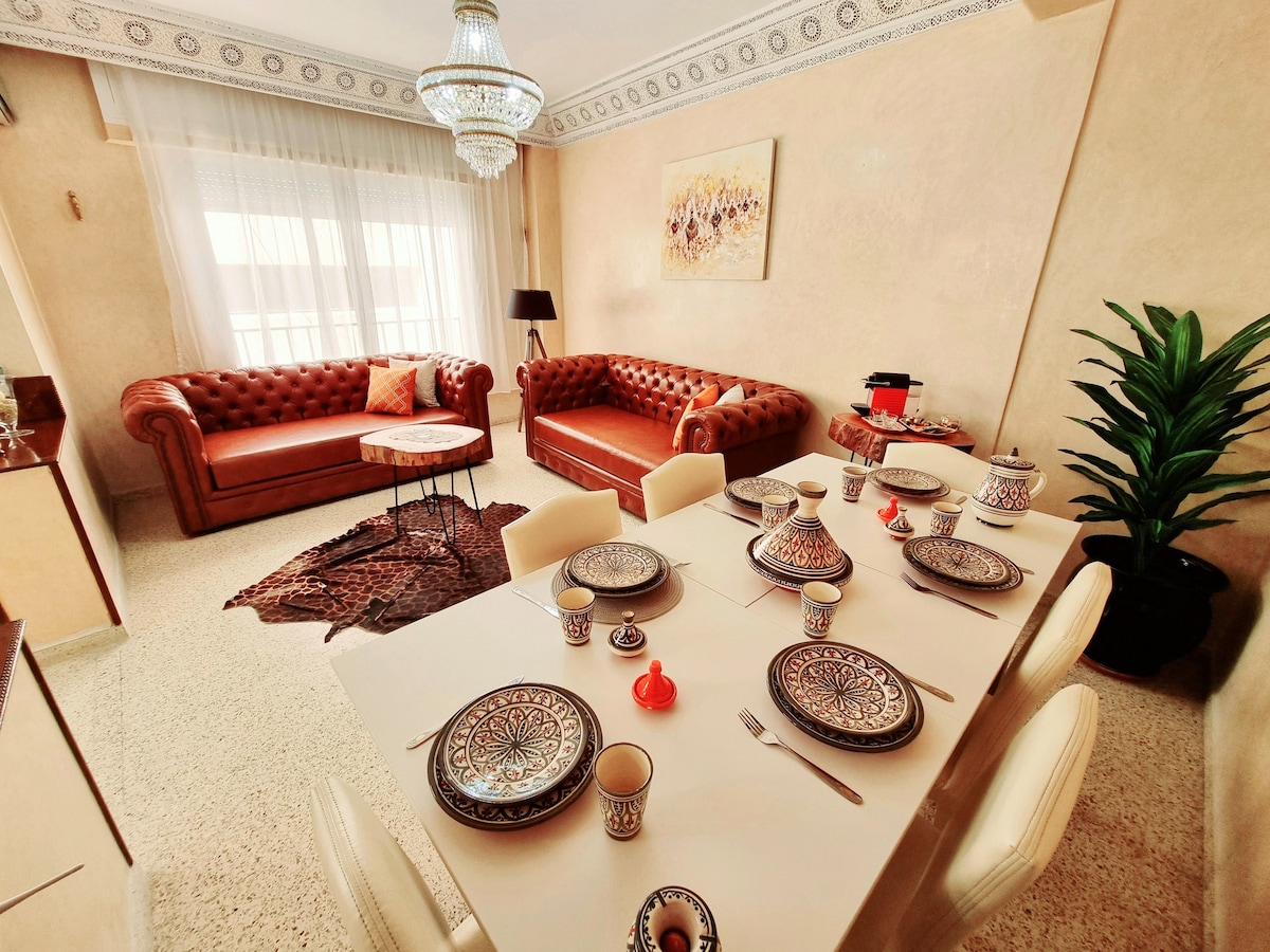Para familias ⚠️ Para grupos de amigos o amigas no mixtos ⚠️ HERMOSO APARTAMENTO CON AIRE ACONDICIONADO QUE SE ENCUENTRA EN EL CORAZÓN DE LA CIUDAD DEPORTIVA DE TÁNGER Tengo el placer de darle la bienvenida con toda la familia a mi prestigioso apartamento situado en el primer piso de mi casa familiar de 3 plantas, que se encuentra exactamente en LOTISSEMENT AL ITTIHAD Nr 57 cerca del liceo de Deportes de Tánger الثانوية التأهيلية الرياضيين طنجة y del hospital privado de Tánger AKDITAL
