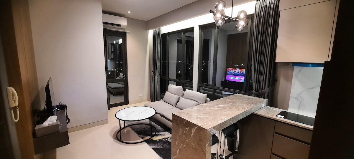 Este moderno apartamento de 2 dormitorios con capacidad para 4 personas está convenientemente situado en el centro de Batam, en la isla de Batam, justo al lado de la terminal de transbordadores de Batam. Diseño de clase mundial con bahía privada y vista directa al mar.
