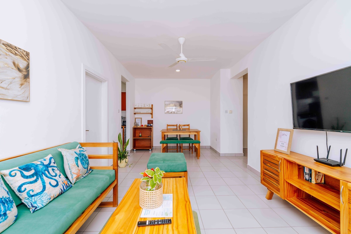 Un apartamento moderno y totalmente equipado a solo 25 minutos de Stone Town/Aeropuerto con vistas parciales del Oceanview, que ofrece un ambiente refrescante. Perfecto para una escapada, para estancias largas y para cualquier persona que quiera trabajar a distancia. Ubicada en Fumba Town, una comunidad cerrada internacional y ecológica con seguridad de primera categoría, servicios comunes, es decir, una piscina de nueva construcción, gimnasio, supermercado, restaurantes, un parque infantil, biblioteca, clínica, cajero automático, licorería y mucho más. Súper limpio, buen wifi y anfitriones listos para ayudarte