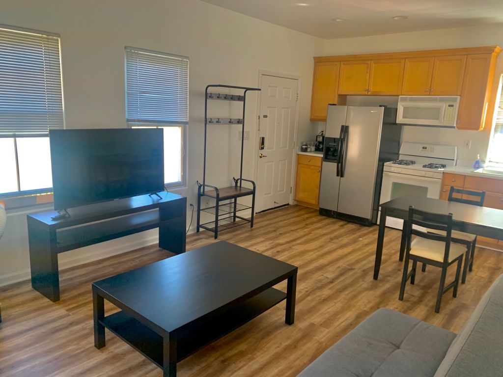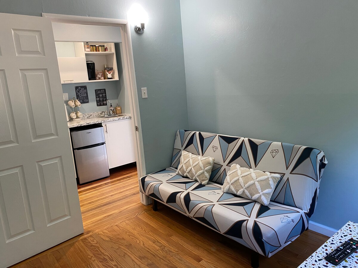 Ven y disfruta de esta unidad de 1 dormitorio. Un dormitorio acogedor y luminoso con una cómoda cama tamaño queen. El salón consta de un comedor dedicado y una zona de relax con sofá y TV. La cocina pequeña incluye microondas, horno pequeño y cafetera K-Cup, pero no HORNO. Calefacción y aire acondicionado recién instalados. Esta suite forma parte de una casa unifamiliar. El resto de la casa también se alquila como unidad de Airbnb, pero con entrada independiente. El área de la terraza es compartida. La entrada está en el patio trasero.