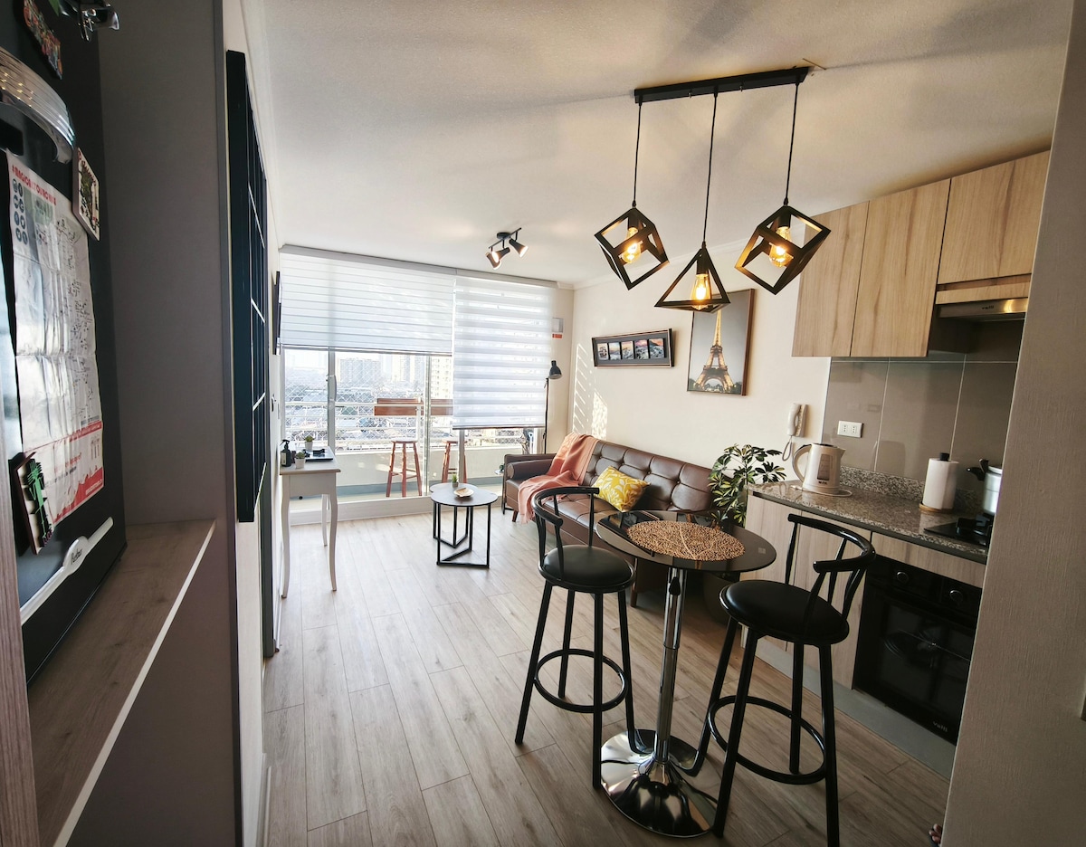 Ven a disfrutar de un hermoso atardecer frente al mar. Departamento de un dormitorio y sillón cama para 3 cómodos huéspedes. Con todo lo necesario para que se sienta como en casa. Cama tamaño King, cocina vitroceramica, lavadora, refrigerador, microondas, TV 55", wifi, terraza, piscina y estacionamiento gratuito. Inmejorable ubicación en península Cavancha, a 200 metros de playa del mismo nombre y frente a playa Brava. Cercano a supermercados, mall y a pasos de bares, pubs y cafeterías.