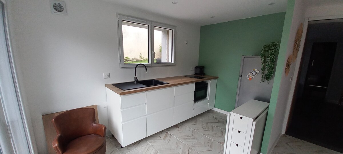 A 2 km del centro histórico de Bayona y de la estación de tren, en un callejón sin salida residencial del barrio de San Bernardo y cerca del Adour Estudio luminoso e independiente de 18 m² reformado con una terraza de 30 m² El alojamiento es de una sola planta y está adyacente a nuestra casa Tranquilo y fresco: A 5 minutos de los centros de Bayona y Boucau A 10 minutos de las playas oceánicas de Tarnos A 15 minutos de las playas oceánicas de Anglet y Biarritz Aparcamiento para coches en el callejón sin salida delante de la casa.
