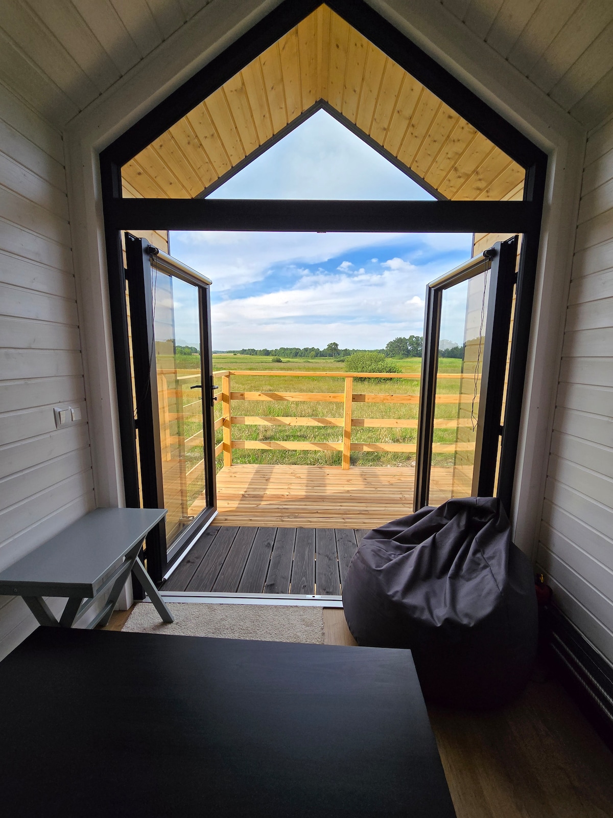 2 Domki do 8 osób dysponują ogromnym tarasem o powierzchni ponad 30m2, wyposażonym w krzesła, stół biesiadny oraz grill gazowy, to wszystko z pięknym widokiem na ogromną przestrzeń pól, łąk oraz lasów. Wszystko stworzone tak aby bez zmartwień przyjechać i wypocząć. Miejsce to jest kolebką ptactwa szlachetnego, odwiedzają nas też często sarny, zające oraz lisy. Jest to też idealna lokalizacja do biesiady lub spotkania towarzyskiego na tarasie, przy ognisku lub otaczającym łonie natury