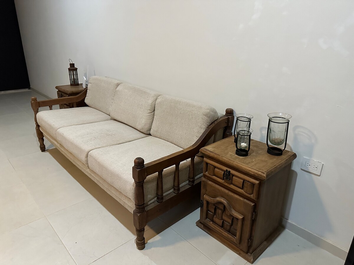 Departamento en planta baja estilo colonial y moderno mezclado con la originalidad de una artista yucateca. Localizado en una zona céntrica de la ciudad, a tan solo 10 cuadras del corazón de Mérida (1.5 km). A 21 minutos a pie del corredor gastronómico y del parque de la plancha. Cuenta con todos los servicios básicos para que disfrutes tu estancia.