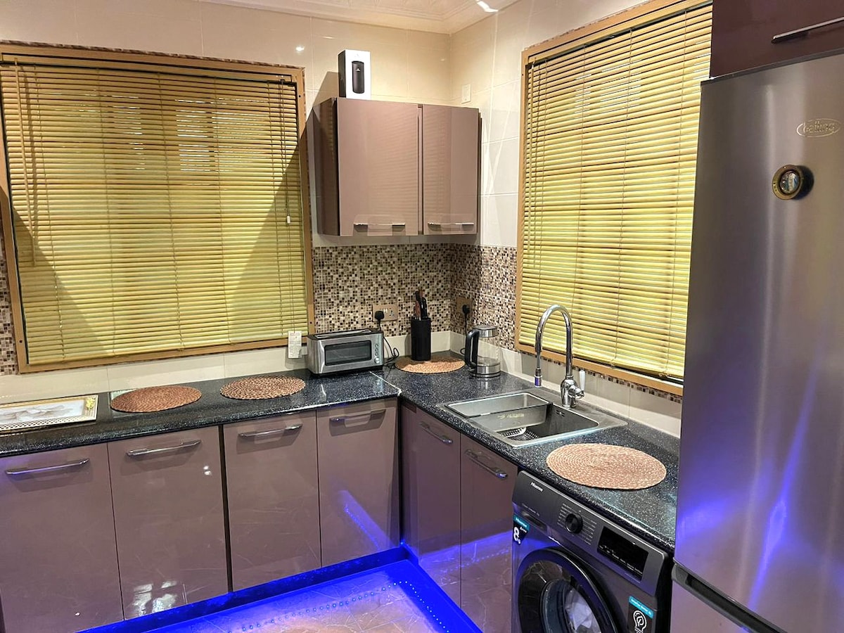 Relax in our stylist yet cozy flat with king size bed,WiFi, standby Generator, Ac, kitchen ,coffee machine, hair dryer, spacious living area, guess washroom, washing machine ) located 3 minutes walk away from Trasaco spring estate. Perfect for couples, solo guests and a family or 3