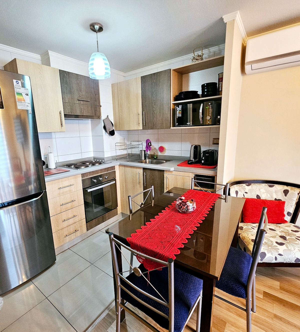Ubicación inmejorable en la ciudad. Depto para hasta 4 personas, equipado y acogedor. Calefacción por aire acondicionado, Termopanel, TV en sala y dormitorio, WIFI por fibra óptica y cerradura digital. A tres minutos caminando del Mall, restaurantes y lugares entretenimiento. Estacionamiento techado. Equipado con todo lo necesario para una estadia excepcional, cuenta con secador de pelo, tostador, lavadora y secadora. Cuenta con terraza cerrada y ventanas termopanel.