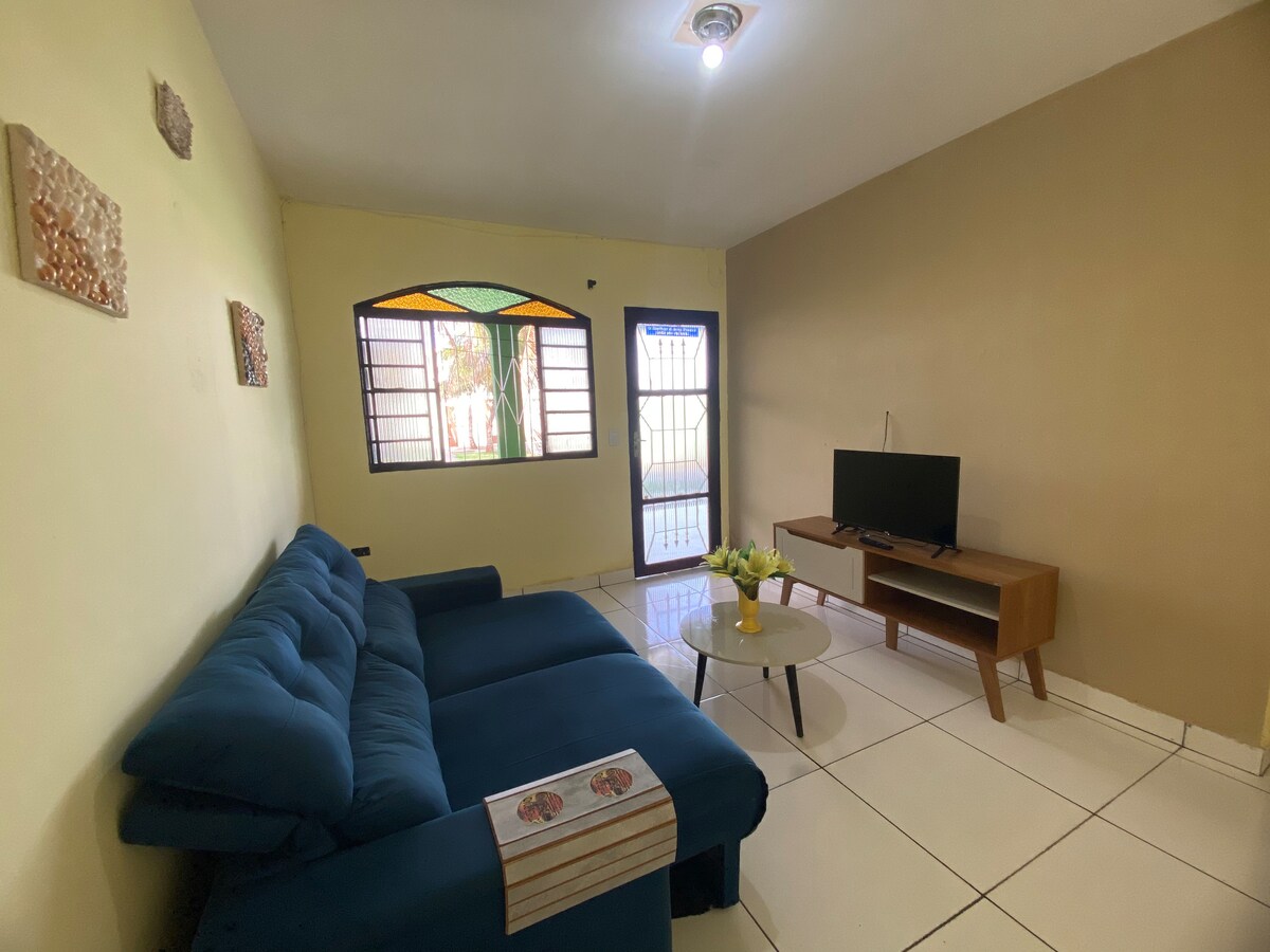 Um lugar para vc e sua família se hospedar com conforto e segurança. Possui ampla varanda nos fundos com churrasqueira. Somente para Reservas a partir de 3 ou mais dias. Ambiente aconchegante e bem cuidado. Nessa casa temos a opcao adicional de liberar uma suíte com closet o que acomoda mais hóspedes com valor adicional a combinar.