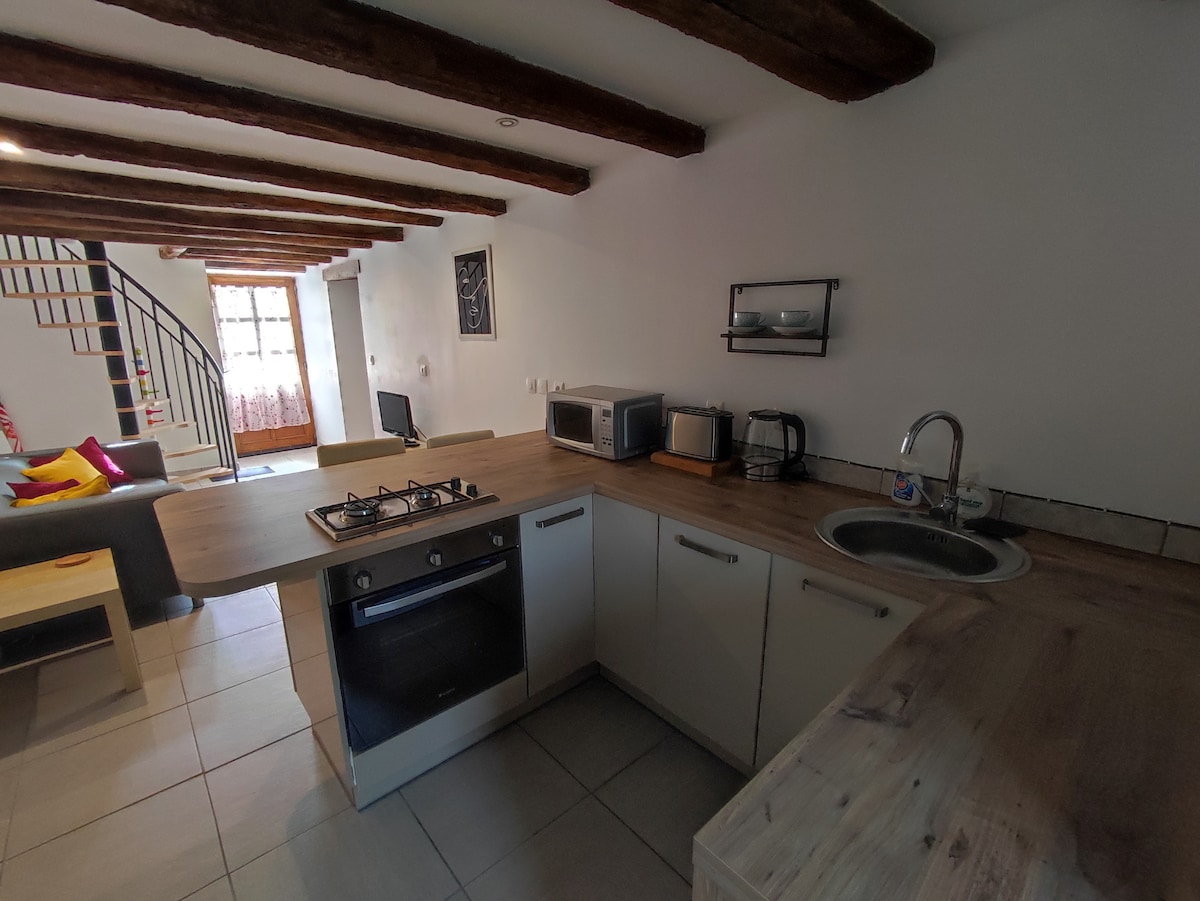 Bienvenidos a la casa rural Pierre & Modernité, un refugio idílico que combina el encanto rústico con el confort contemporáneo. Ubicada en el corazón del campo, esta casa de piedra ofrece una experiencia única donde la tradición y la modernidad se encuentran armoniosamente. Con sus hermosas vigas de roble y su moderno interior, la casa ofrece un amplio salón con un sofá cama y una cocina totalmente equipada