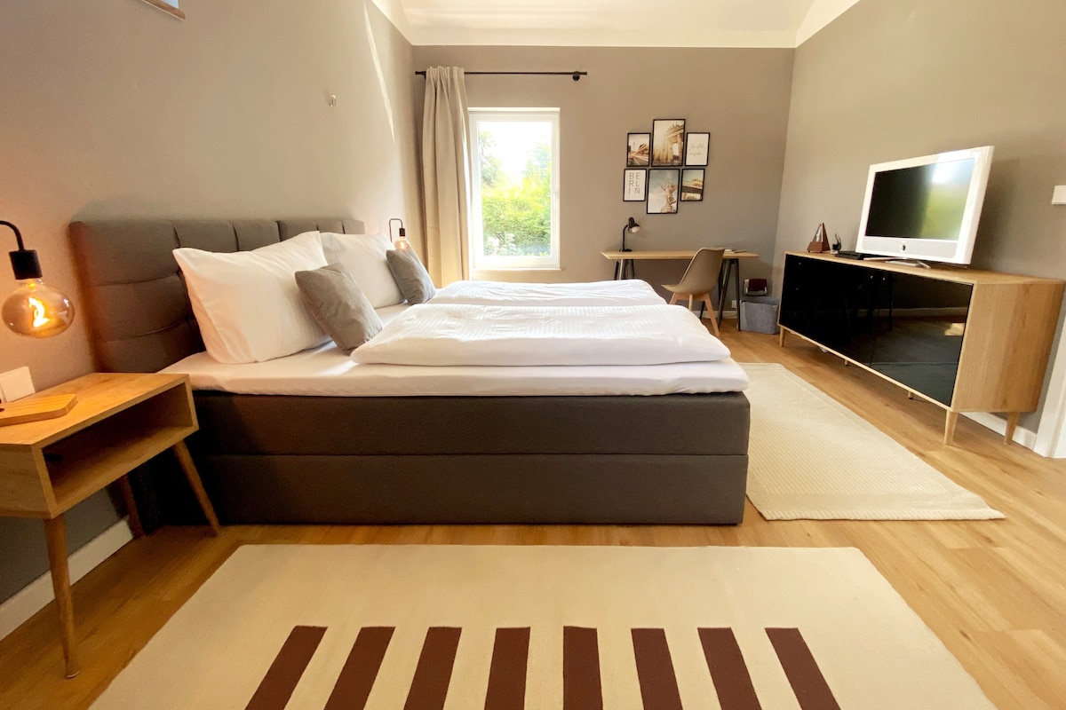 El alojamiento está situado en el hermoso lago Teupitz, que es adecuado para nadar y todo tipo de deportes acuáticos. La casa es de nueva construcción y cuenta con todo tipo de dispositivos modernos que hacen que la vida sea extremadamente cómoda. El interior se ha adaptado al apartamento junto al lago de forma luminosa y contemporánea. Una cama tamaño king con somier te invita a terminar cómodamente un día activo en la naturaleza de Brandeburgo. Además, nuestros huéspedes pueden disfrutar de deliciosos tés y café Nespresso.