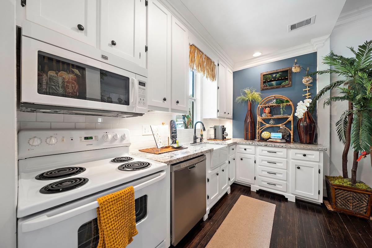 -Casita De Palmera- Relax on the lighted, palapa-covered deck with your coffee or cocktail! Family + pet friendly! Less than a half mile to Galveston's Historic Downtown area and a short 4 minute drive to the beach! Close to all of the fun, shopping, live music and restaurants on The Strand! -Fenced backyard -800+ MBPS Wifi -4 Smart TVs w/ Roku capability to stream with your accounts -Arcade & board games -Wood Grill -Beach towels & toys Close to cruise terminals & ONE block to cruise parking!