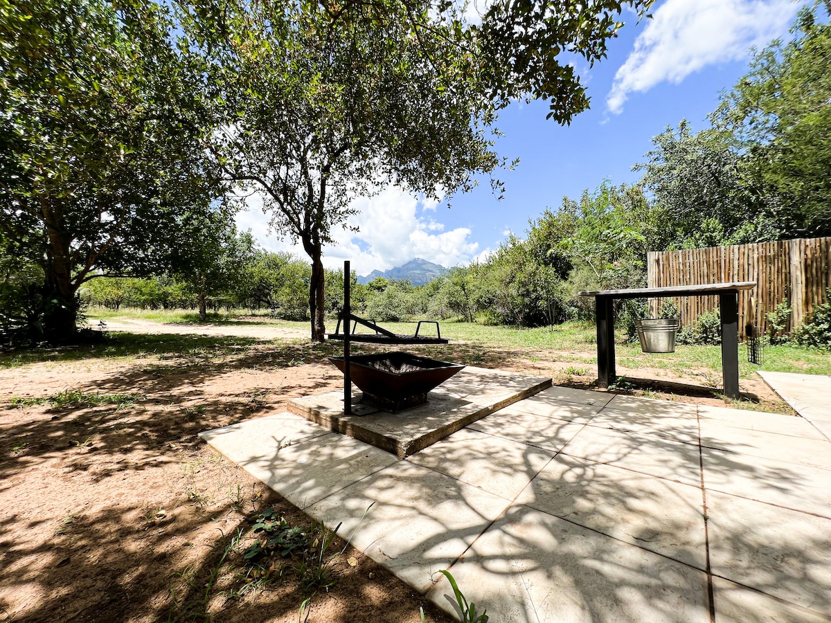 This self-contained chalet has a queen-sized bed and ensuite bathroom. It has an air-conditioner, Wi-Fi, DStv, Kitchenette, BBQ, lounge and patio. Bush View Chalet 1 is partially Loadshedding FREE! There is no housekeeping service.
