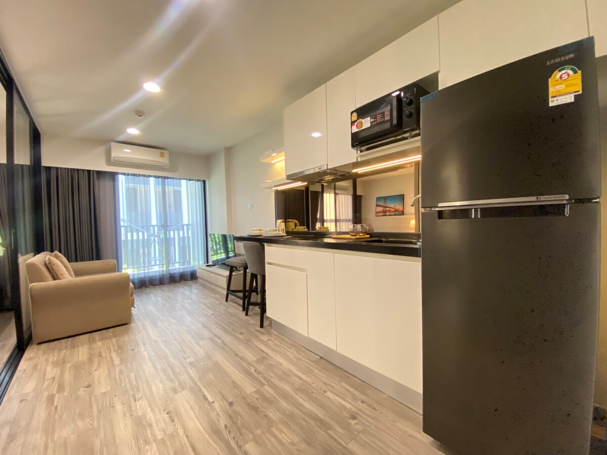 - 40 metros cuadrados de un dormitorio con cocina y lavadora en el edificio Bangkok Tryp. - No es adecuado para un niño. - No se permite fumar ni consumir cannabis. - Cerca de BTS N4 Sanampao, salida#3 (7 minutos a pie) - Sala de estar con sofá/baño privado con ducha, secador de pelo, artículos de tocador y toallas. - Aire acondicionado/Wifi/ TV/Caja de seguridad. - Almacenamiento de equipaje gratuito/seguridad las 24 horas. - Fácil llegada y de salida/plaza de aparcamiento gratuita. - Piscina y gimnasio *Los apartamentos están en 2-4 pisos, esquinas o unidades medias (dependiendo de la disponibilidad).