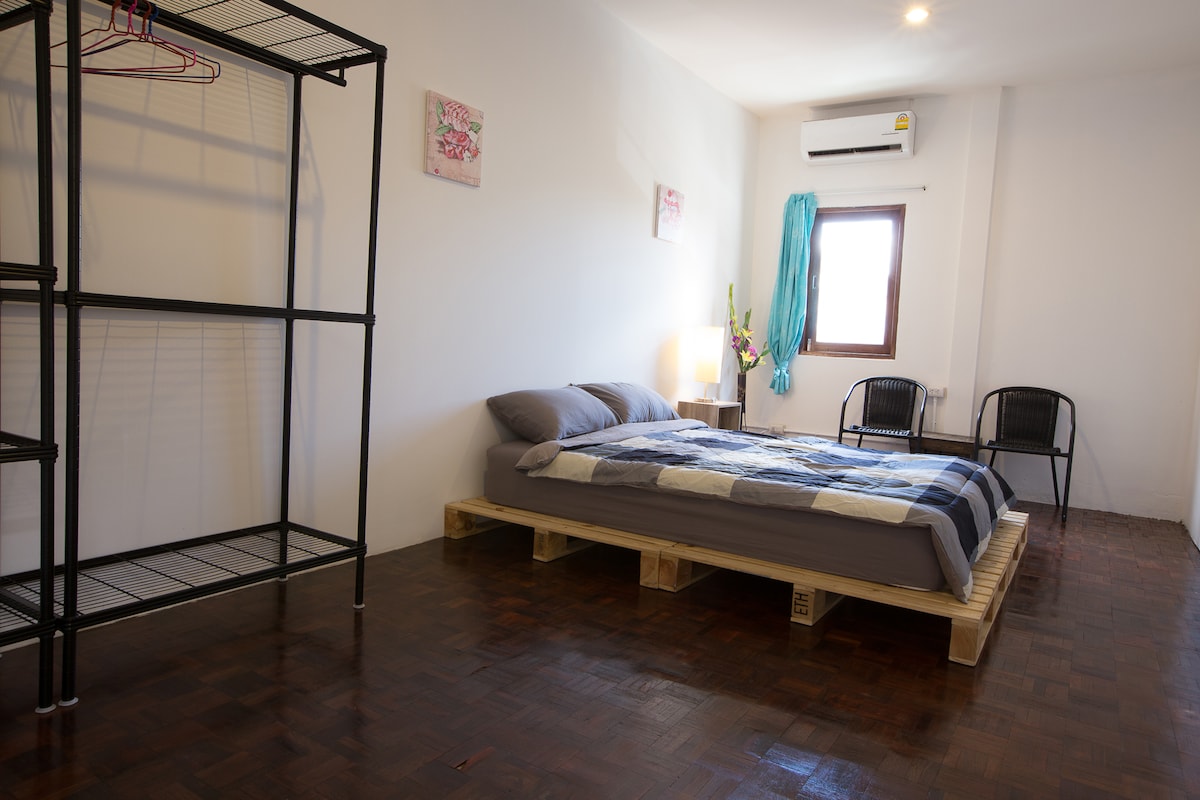 Esta es una habitación privada de 13,5 metros cuadrados, tiene 1 cama tamaño queen y baño privado (integrado). Pantalla plana y aire acondicionado. Renovamos nuestro alojamiento de una antigua casa china. La decoración interior está inspirada en el estilo de vida tailandés-chino local. El edificio tiene 2 plantas con balcón adicional en la azotea. Nuestra ubicación está en el barrio chino, a unos 100 metros de la estación de Wat Mongkhon (MRT). El nombre del edificio es Live Local Yaowarat Cafe & Hotel.