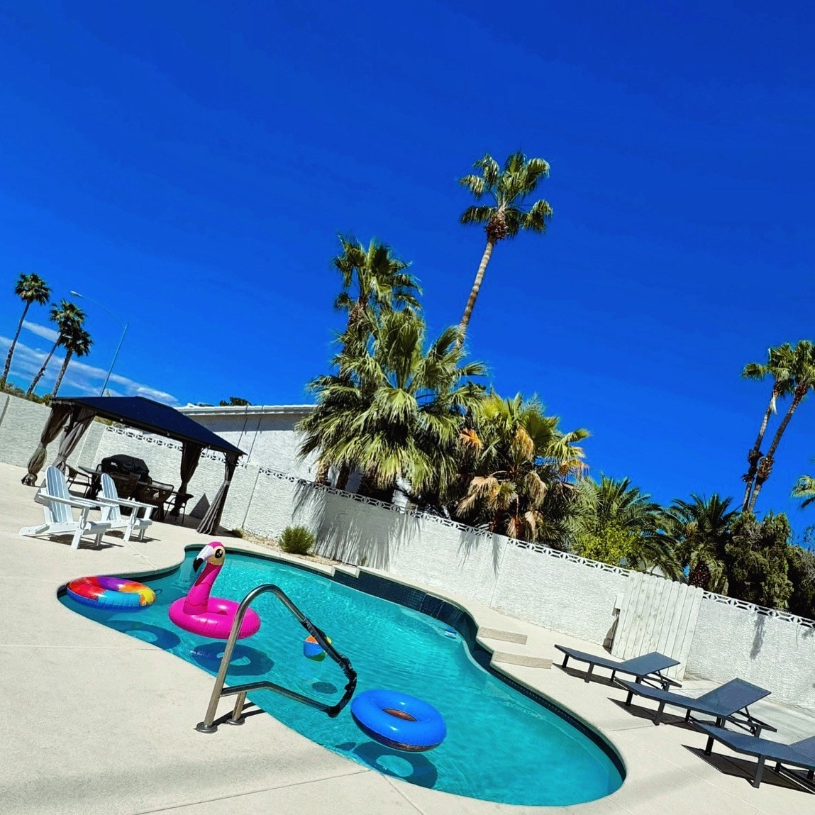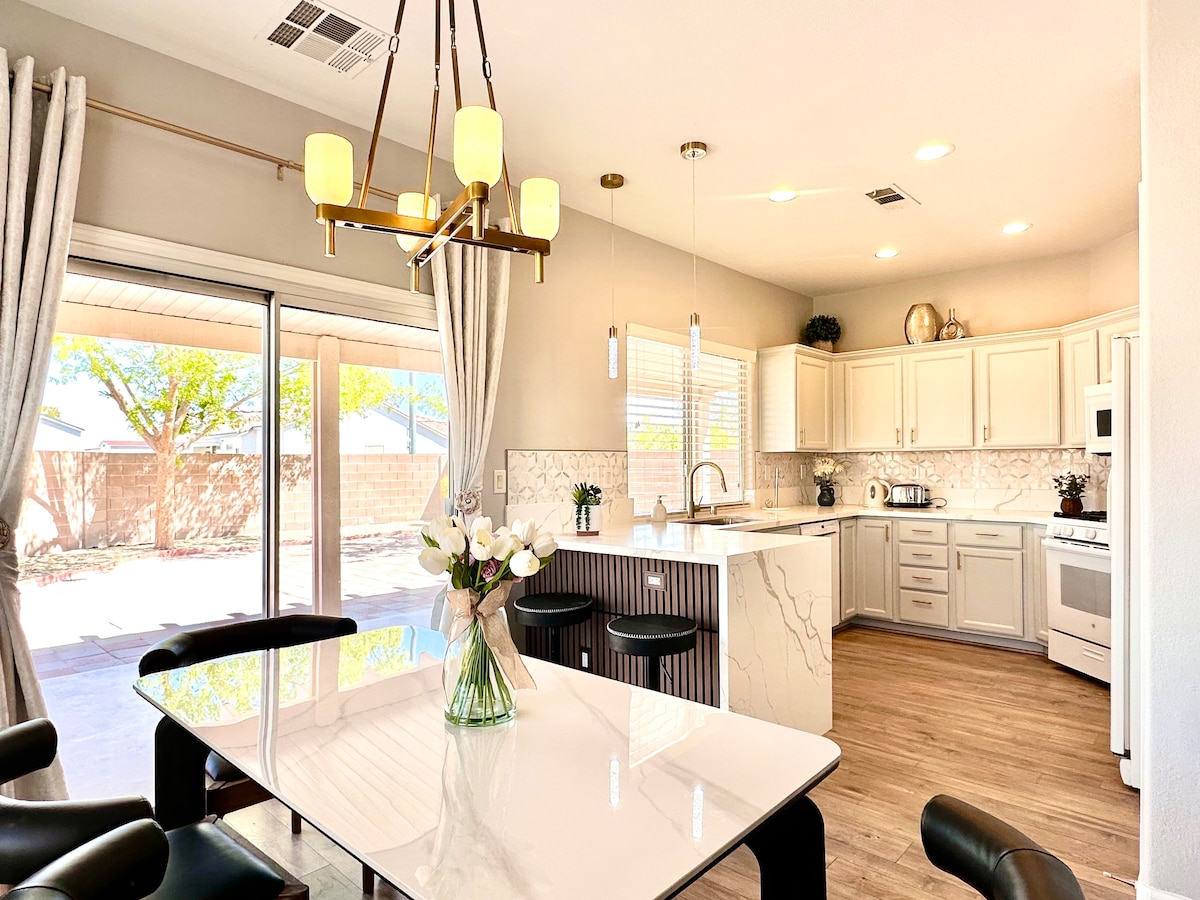 Hermosa y espaciosa casa de 4 dormitorios/3 baños con 5 camas/puff que se convierte en un colchón doble. Casa ubicada a menos de 3 millas del Strip/Aeropuerto. Suite principal con baño privado. TV de 86 pulgadas en la sala de estar. Cocina totalmente equipada para cualquier ocasión. Espacio de trabajo dedicado en todas las habitaciones. Hasta 1 GB de internet rápido para todas tus transmisiones, trabajo y videollamadas para tu grupo. 2 juegos de arcade y una mesa de póquer. Piscina privada a nivel del suelo. Barbacoa al aire libre. También ubicada en una calle privada sin salida. Se admiten mascotas y familias.