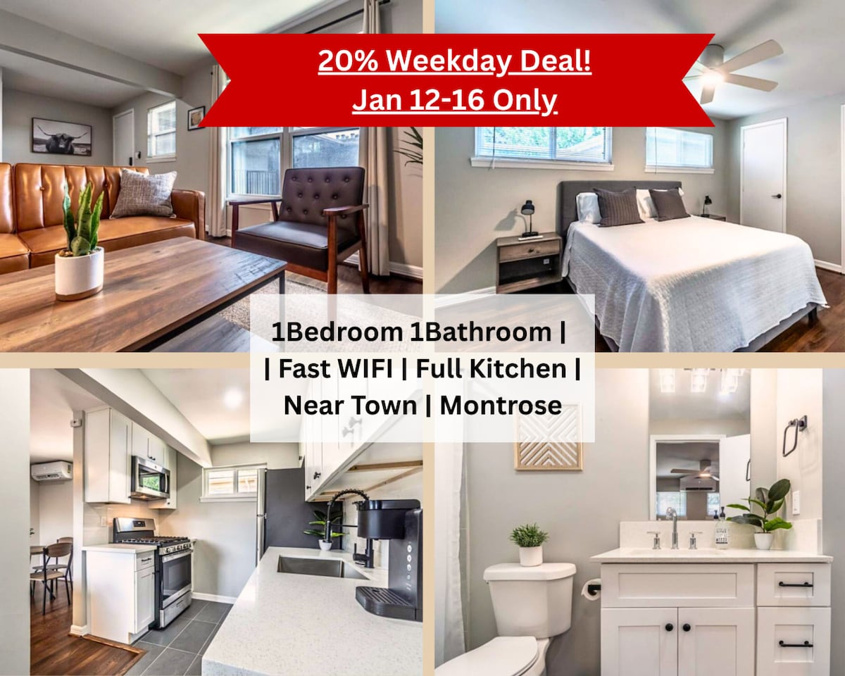 ¡Te damos la bienvenida a tu retiro en Montrose! Este loft de 2 dormitorios/1B cuenta con cómodas camas tamaño king, estacionamiento gratuito y wifi rápida. Relájate en la acogedora sala de estar con dos sofás, TV y zona de trabajo. Disfruta del patio privado o cocina en la cocina completa con una estufa de gas. Situado en el corazón de Houston, estás a pocos minutos de los mejores restaurantes, bares, museos y estadios. Ya sea que estés aquí para explorar o relajarte, ¡te encantará el espacio luminoso y acogedor!