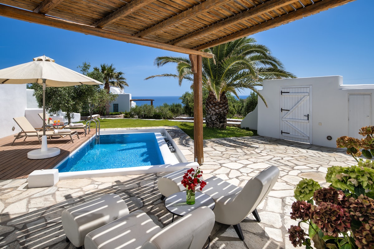 Cerca de Parikia (ciudad principal) y Pounda (ferry a Antíparos), esta villa de 180 metros cuadrados (1,940 pies cuadrados) ofrece impresionantes vistas a la montaña y al mar. Ubicado en una tranquila zona agrícola, a 3 km de Parikia, garantiza total privacidad con amplias áreas al aire libre y una gran piscina. Un camino oculto conduce a la arena de Parasporos Beach. Decorada cuidadosamente por su propietario, la villa combina los principios del Feng Shui con elementos tradicionales, materiales naturales y tonos relajantes para crear un refugio tranquilo.