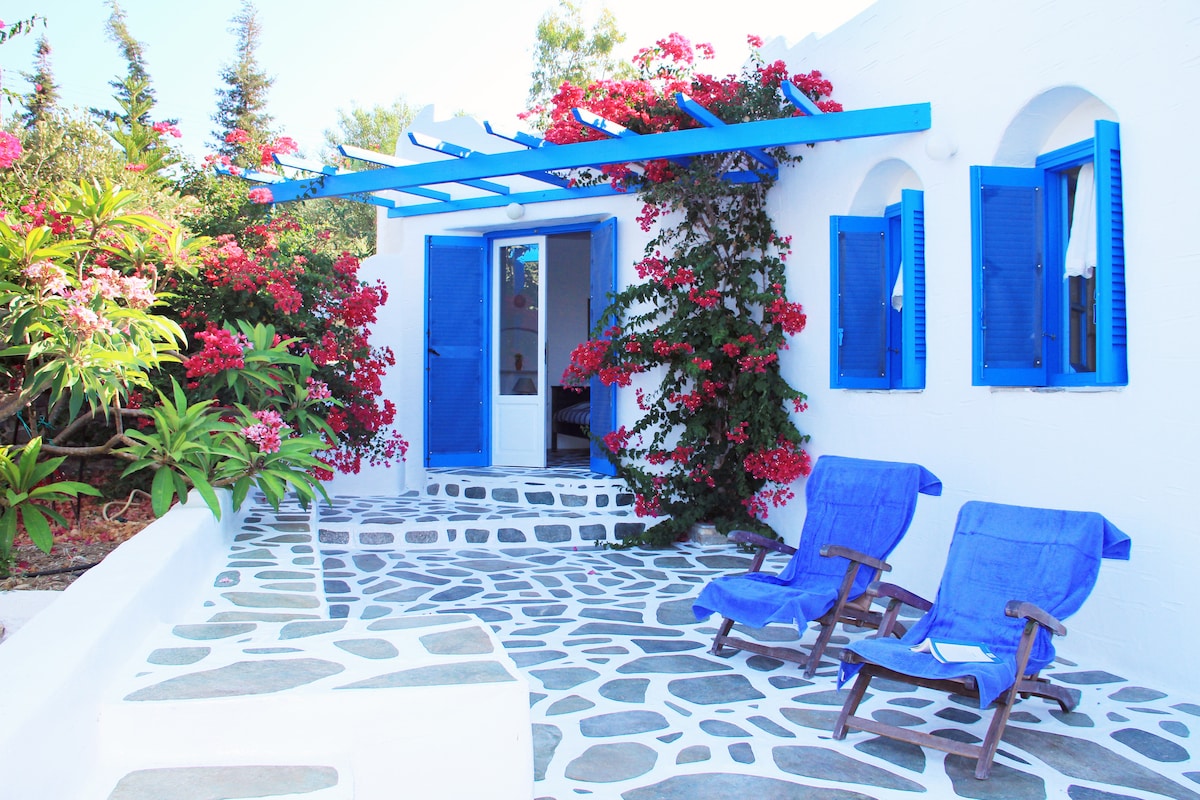 It's a cottage house on a very quiet and peaceful place on the northeast side of the island. You have an amazing view to the Aegean Sea, which gives you the opportunity to relax and rest while being on your vacation. There is one master bedroom with a queen bed with a Grecostrom Bodytopia Series matress and two single beds in the resting area which is shared with the kitchen. It's also fully equipped kitchen and a bathroom, which will give you the ability to enjoy your vacation at your own pace.