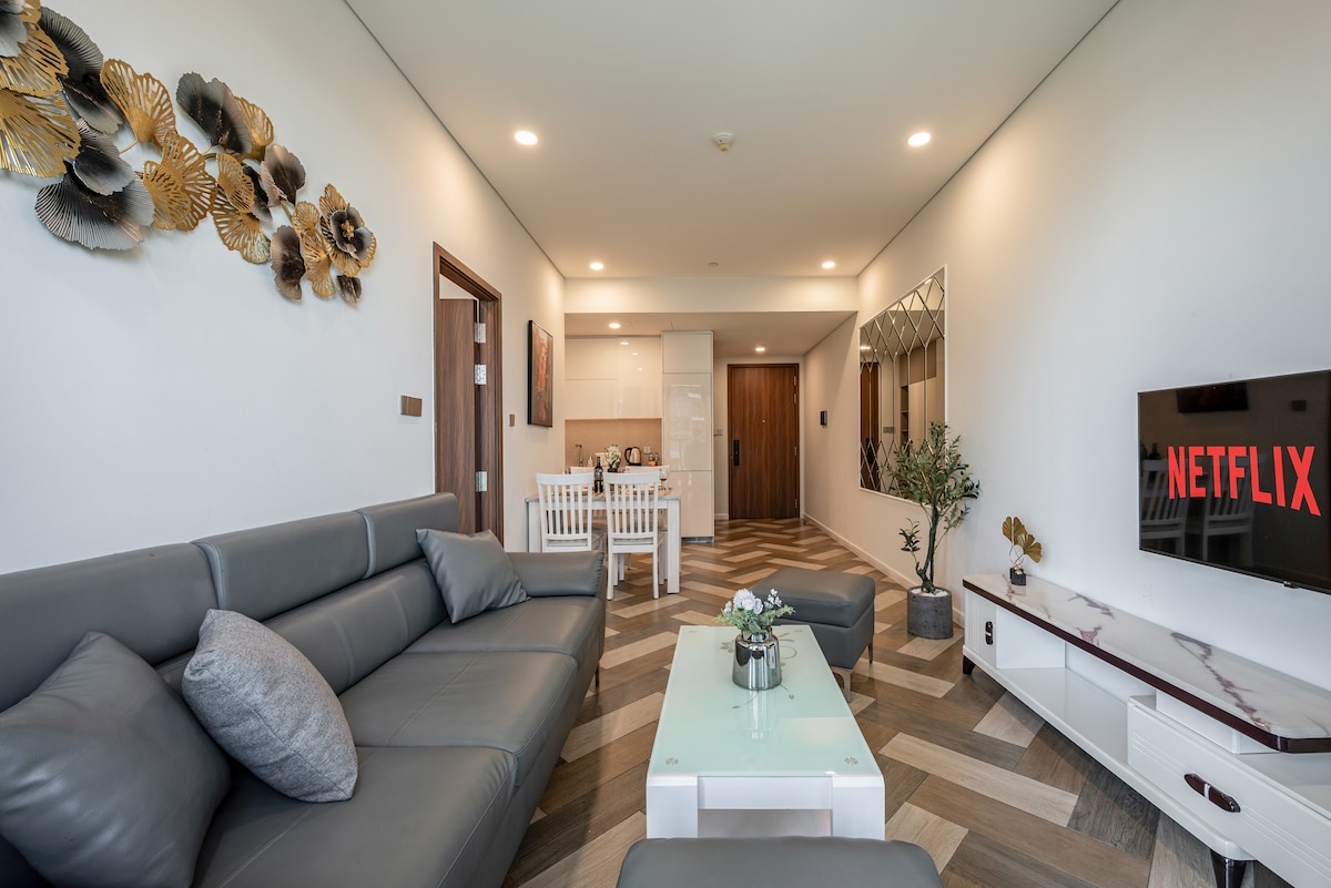 Luxury 5* The Opera Residence by ChiHome - River View CBD District 1, SkyVilla Corner Apartment - Tower A Level 2x.03A, 70m2, 2 habitaciones. La Ópera Metropole Thu Thiem - Torre A, Massimo, nivel 2x unidad 03A - Tamaño: 70 m2 (unidad de esquina) - Incluye 2 dormitorios, 2WC, cómodos para alojarse de 2 a 4 personas. - Televisión inteligente de 65 pulgadas con Netflix y YouTube - Sofá, sillón, mesa de té. - Mesa de comedor con 4 sillas. - Utensilios de cocina completos. - Internet inalámbrico de alta velocidad disponible. • Aire acondicionado para toda la casa - Acceso 24/7 al edificio, los 7 días de la semana.