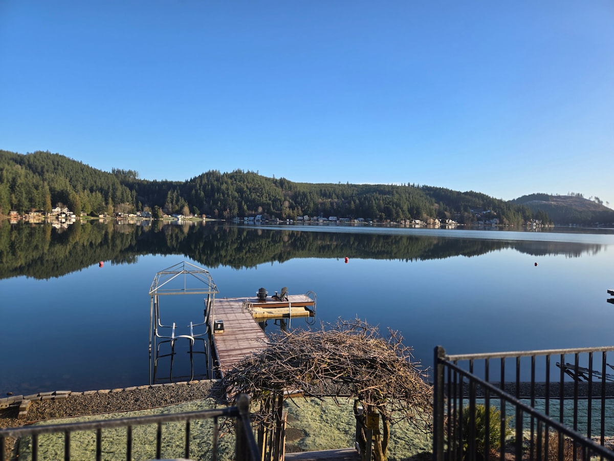 Casa frente al mar, estilo cabaña con diseño de planta abierta. Situado directamente (pesca desde la cubierta con marea alta) en la impresionante ensenada de Skookum en Puget Sound. Tu estancia en «Kravitz-Port» te ofrece una vista a nivel del mar de una granja de ostras del noroeste. La ensenada es un refugio de vida silvestre para focas, águilas, nutrias, etc. Todos pueden ser vistos en su hábitat natural mientras te sientas en la terraza con una vista panorámica de 90 grados al mar. Vislumbra la serenidad desde cualquier lugar donde descanses en Kravitz-Port, dentro o fuera de la casa.