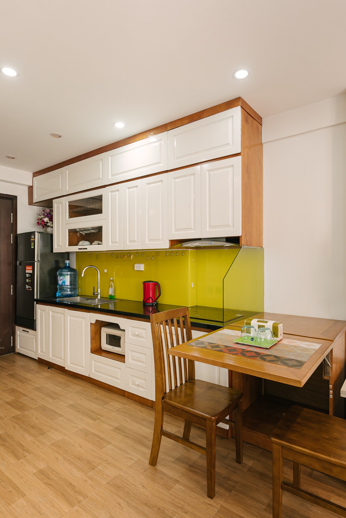 studio - 35m2 Luxury apartment on the 09th floor in D'CAPITALE Trần duy hưng str, Trung hòa area, Hà nội 1 queen bed with soft high quality mattresses 1 BATHROOM: Fully equipped KITCHEN: fridge, microwave, electric kettle, pots, pans, hot pot cooker, … LIVING ROOM: comfy sofa, 1 balcony from the 09th floor, water dispenser; WASHING MACHINE The building near by Vincom Centre, BigC supermarket, ATM, cinema, kid playground, ...