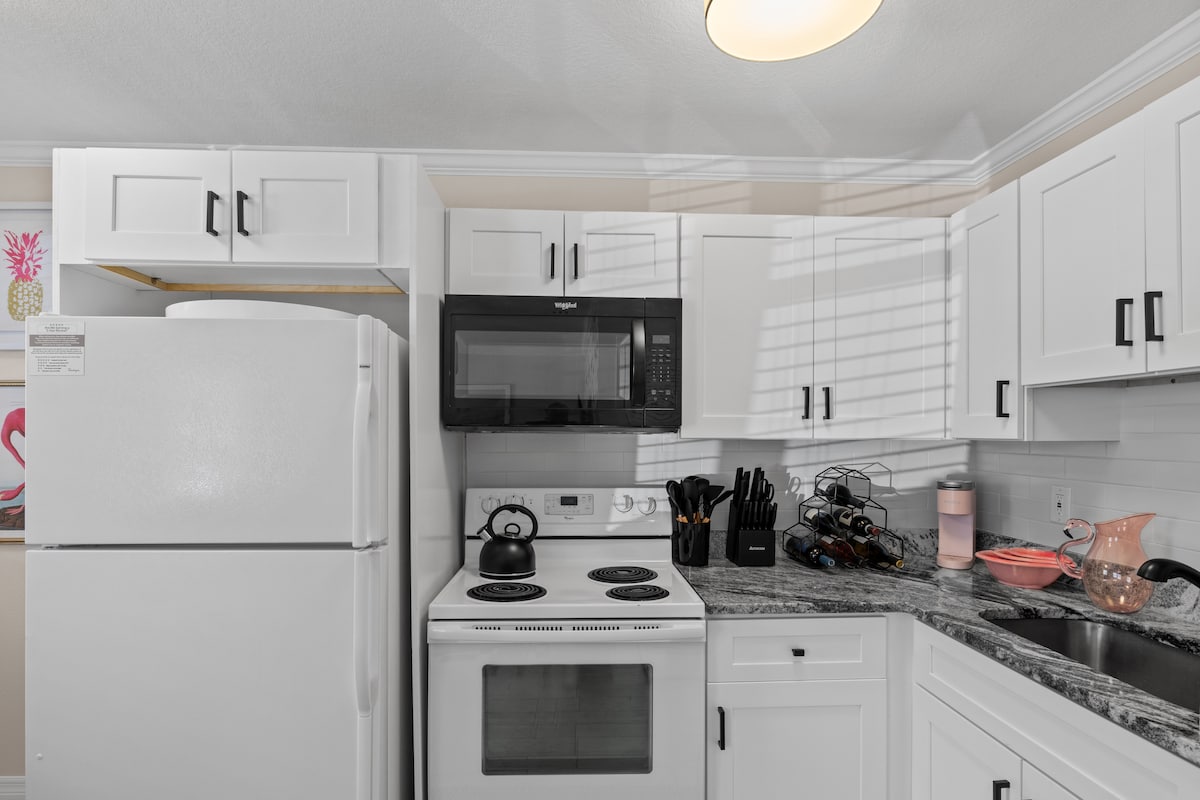 Nuestro apartamento tiene espectaculares vistas al agua desde la bahía hasta la playa. Tenemos una cocina grande y única en nuestro centro vacacional, con encimeras de granito, armarios de madera y todos los electrodomésticos de acero inoxidable. Se proporciona todo lo necesario para preparar una comida junto con especias y condimentos básicos, café, crema y azúcar. El dormitorio principal tiene una nueva cama tamaño king y un vestidor con todo el equipo de playa también disponible para tu uso. También tenemos 2 televisores de pantalla plana de 50 pulgadas con cable.