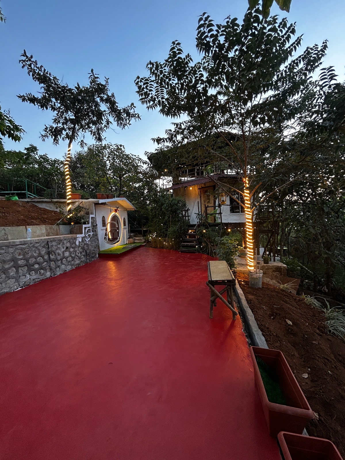 En el pintoresco valle de Kolvan, (Tal. Mulshi) esta casa de campo ecológica se mantiene fresca incluso en climas cálidos. Su característica de ladrillo y madera debería acercarte más a la naturaleza. Está inspirada en el gran arquitecto Laurie Baker. Está en una parcela de ~8000 pies cuadrados y tiene una construcción de 900 pies cuadrados, el resto es para árboles nativos y jardín. Te encantará este lugar por las vistas, la ubicación y la serenidad que ofrece. La casa de campo se encuentra en una comunidad cerrada de casas de fin de semana. La persona de seguridad está allí todo el tiempo. Cabaña + jardín y zona abierta de unos 7000 pies cuadrados. Esto incluye un cenador con vistas al lago al otro lado de la calle, de unos 170 pies cuadrados. El huésped puede acceder a toda la casa y la parcela. La cabaña tiene las siguientes zonas: 1 cama, 1 baño, 1 lavabo y 1 aseo. Hay agua caliente disponible a través de un géiser de gas. Cocina: bien equipada con cocina y gas, té/café en polvo y azúcar/aceite + utensilios y cubiertos, tiene nevera y agua potable con dispensador. Comedor: tiene capacidad para 4 personas a la vez, ofrece vistas al lago mientras comes. Tiene soportes para velas, así que si planeas una cena a la luz de las velas, puedes traer tus velas aromáticas favoritas. Sala de estar: junto con el comedor, esta es un área multiusos de 275 pies cuadrados. Si necesitas más espacio, la mesa de comedor y las sillas se pueden mover y otros muebles se pueden reorganizar para crear más espacio. Los huéspedes adicionales (después de 2) pueden dormir aquí, ya que contamos con 4 colchones y juegos de cama adicionales. Tiene un ventilador de techo y un ventilador de pie. Dormitorio: tiene un armario para la ropa, tiene pocas perchas y principalmente almacena los colchones y juegos de cama. Cuenta con una pequeña estantería con libros, luces de emergencia y botiquín de primeros auxilios. También tiene un tocador con un gran espejo, un cajón y cosas básicas como polvo/peine, etc. Tenemos alfombras de paja (finas) que son cómodas para poner rápidamente en el suelo para sentarse. Una cama doble tamaño queen con mesitas de noche y una lámpara de noche. El dormitorio tiene un ventilador de techo. Zona de estar trasera: cuando pasas por el pasillo desde el área del baño a través de la puerta trasera de la casa de campo, hay una pequeña zona de estar en la parte trasera. Este espacio también se puede utilizar para jugar a los dardos. Hay un gancho en la pared de esta zona para colgar el tablero de dardos. Cubierta de madera: desde el comedor hay una cubierta de madera que ofrece hermosas vistas a las montañas y al lago de enfrente. También es un buen lugar para bañarse en los rayos del cálido sol mientras bebes tu té de la mañana. Porche: en la entrada de la cabaña, frente al jardín y con vistas al lago, hay un columpio de caña (para una persona) unido al techo del porche para relajarse, tal vez con un libro para leer y disfrutar de las vistas. El estacionamiento está en la entrada para 1 coche + 2 bicicletas. Se pueden estacionar más coches en la entrada. También hay 2 bicicletas aquí para que las montes. Las llaves de las bicicletas están con el asistente. Todo el espacio está disponible para los huéspedes, así que no dudes en explorar, solo cuida el jardín y no arranques flores o frutas de los árboles. Dado que es una comunidad cerrada de casas de fin de semana, las calles interiores también tienen plantaciones a los lados y los huéspedes pueden acceder a la zona para dar un paseo o montar en bicicleta. Hay que tener cuidado de no molestar a los vecinos. Nuestro asistente te ayudará a mostrarte el lugar y te dará las llaves. Tendrás que devolverle las llaves. Hay un guardia de seguridad para las instalaciones. Opciones de comida: Hay comida de estilo nativo agradable y hogareña disponible y se puede entregar en la casa de campo. Se proporcionarán los datos de contacto de la persona que proporciona los alimentos. Recomendamos esta opción, aunque hay otras opciones disponibles si puedes visitar el restaurante y prefieres comer allí o llevar comida. Los cargos por comida están separados. La ubicación está en el corazón de la naturaleza (valle de Kolvan), donde las montañas están por todas partes y en el medio hay un lago. Es tranquilo y, por lo tanto, ideal para relajarse y estar en familia. Otros lugares de interés cercanos: - Fuerte Tikona, a 3 km: ¡bonita caminata! Se tarda unos 45 minutos en llegar a la cima del fuerte. Hay un antiguo Shiv mandir en la parte superior y ofrece impresionantes vistas de 360 grados de la zona. - Presa de Pavna, 8 km: las aguas estancadas de Pavna también ofrecen vistas espectaculares. Si está abierto, navegar en Pavna es inmejorable. - Fuerte Tungi/Lohgad, 15 km: atracciones para excursionistas. - Shri Kshetra Pandurang, 5 km: este templo en la cima de una colina está situado en un área de aproximadamente 300 acres. El camino es agradable y el coche puede llevarte directamente al templo. Es un templo de Satya Sai Trust de Panduranga y Rukmini. Tiene un jardín enorme y ofrece bonitos lugares para sentarse y disfrutar de las vistas. - Chinmaya Vibhooti, Kolvan, 4 km: la sede de la misión Chinmaya está en Kolvan, llamada Chinmaya Vibhooti y devotos de todo el mundo visitan este lugar. El templo de Ganesha en la cima de la colina también ofrece unas vistas espectaculares del valle. La mejor opción es traer tu propio coche. Si no, llama a un taxi para llegar aquí. Los taxis de Radiowings vienen aquí desde Pune. Sin embargo, también se puede llegar en autobús. Los autobuses PMT a Javan, Pavnanagar, Tikona peth pasan por esta ubicación y pide al conductor que se detenga en la presa de Hadshi.