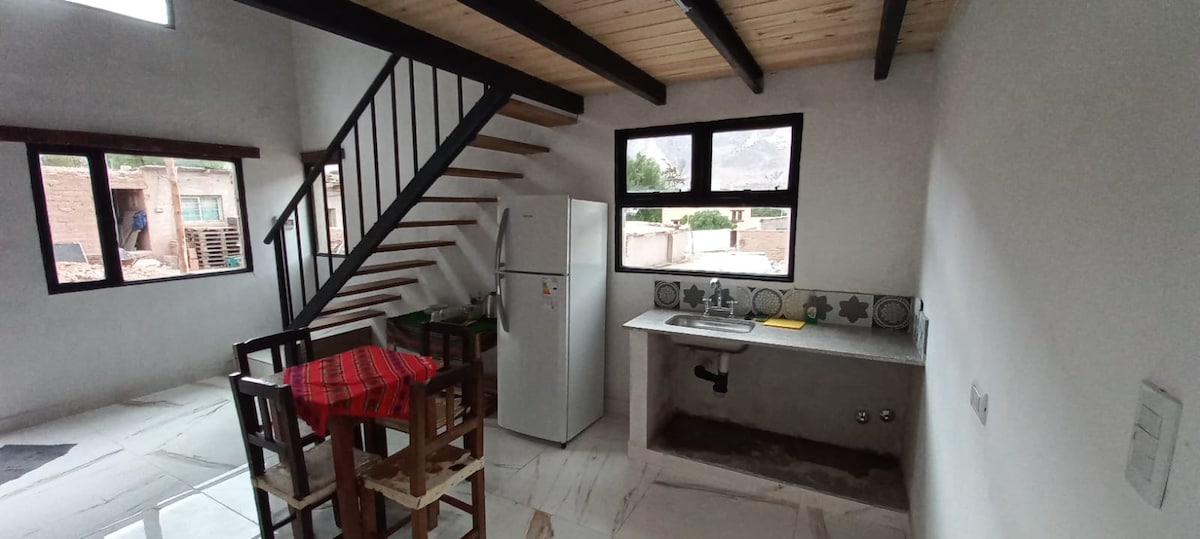 Es una cabaña amplia para cinco persona cuenta con una cama matrimonial y tres camas de una plaza y media con un baño con ducha agua caliente por termotanque solar una cocina pequeña una heladera bacha y una pileta pequeña para lavar ropa si lo desea en el dormitorio mas amplio se encuentra las camas de una plaza y en dormitorio mas pequeño la cama matrimonial donde también se encuentra una s ventanas amplia donde se puede ver el paisaje del pucara cuenta con un asador y una mesa