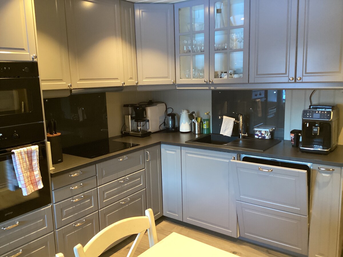 Ta med hele familien til dette flotte stedet med mye plass . Leiligheten er nyoppusset og innehar helt nytt bad - stue + 2soverom m/ dobbelt senger ferdig oppredd + sovesofa i stuen hvor sengetøy er plassert under enden av sovesofa. Barneseng er i skap soverommet.Nytt kjøkken og eget vaskerom med vaskemaskin og tørketrommel . Egen stor terasse med grill og møbler .Egen parkering for flere biler utenfor . Mulighet for EL bil lader v/forespørsel .