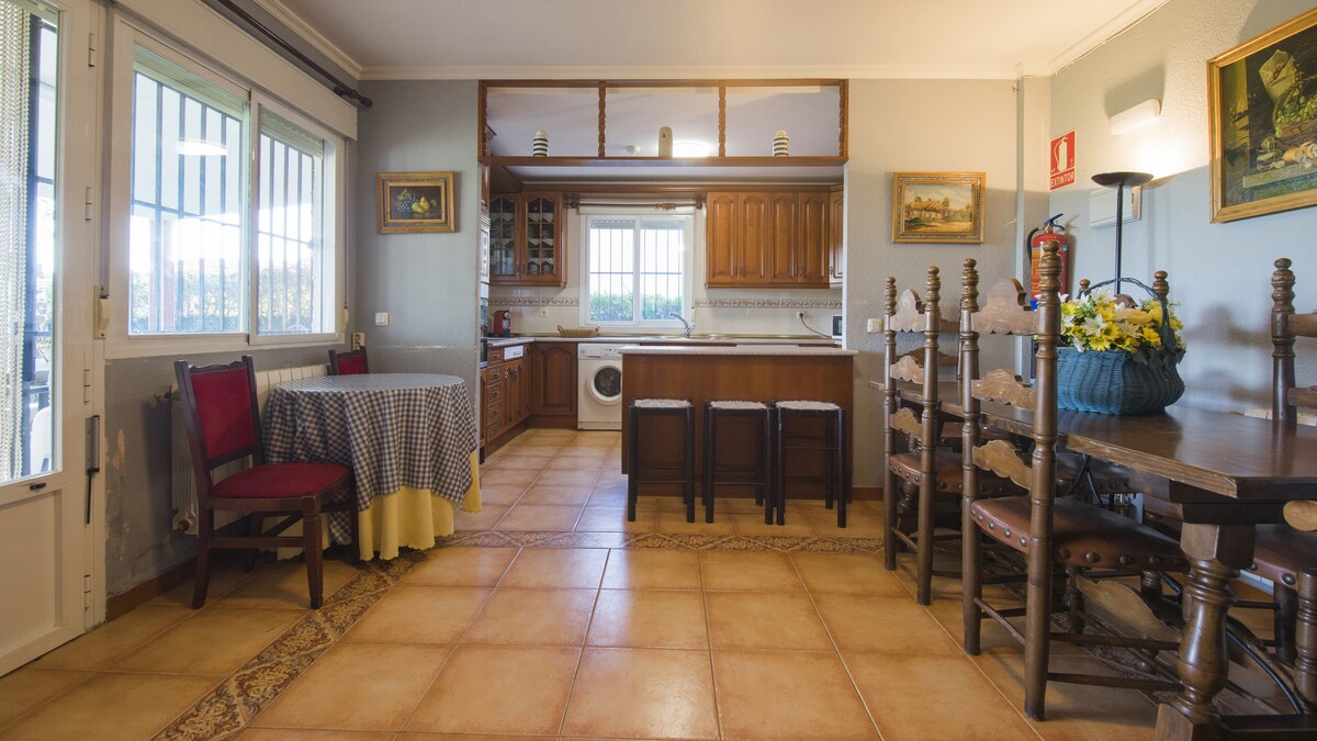 Es un chalet con piscina (abierta desde el 12 de mayo), barbacoa y un amplio jardín de 1300m2 con tobogán, columpios, porterías de fútbol, diana de dardos,... ideal para familias con niños. La piscina esta abierta desde el 12 de mayo hasta el 30 de septiembre. Está a mitad de camino entre Madrid y Toledo (30 minutos). Tenemos otra casa a menos de 50 m con capacidad para 20 personas. El Jardín de los Niños 2.