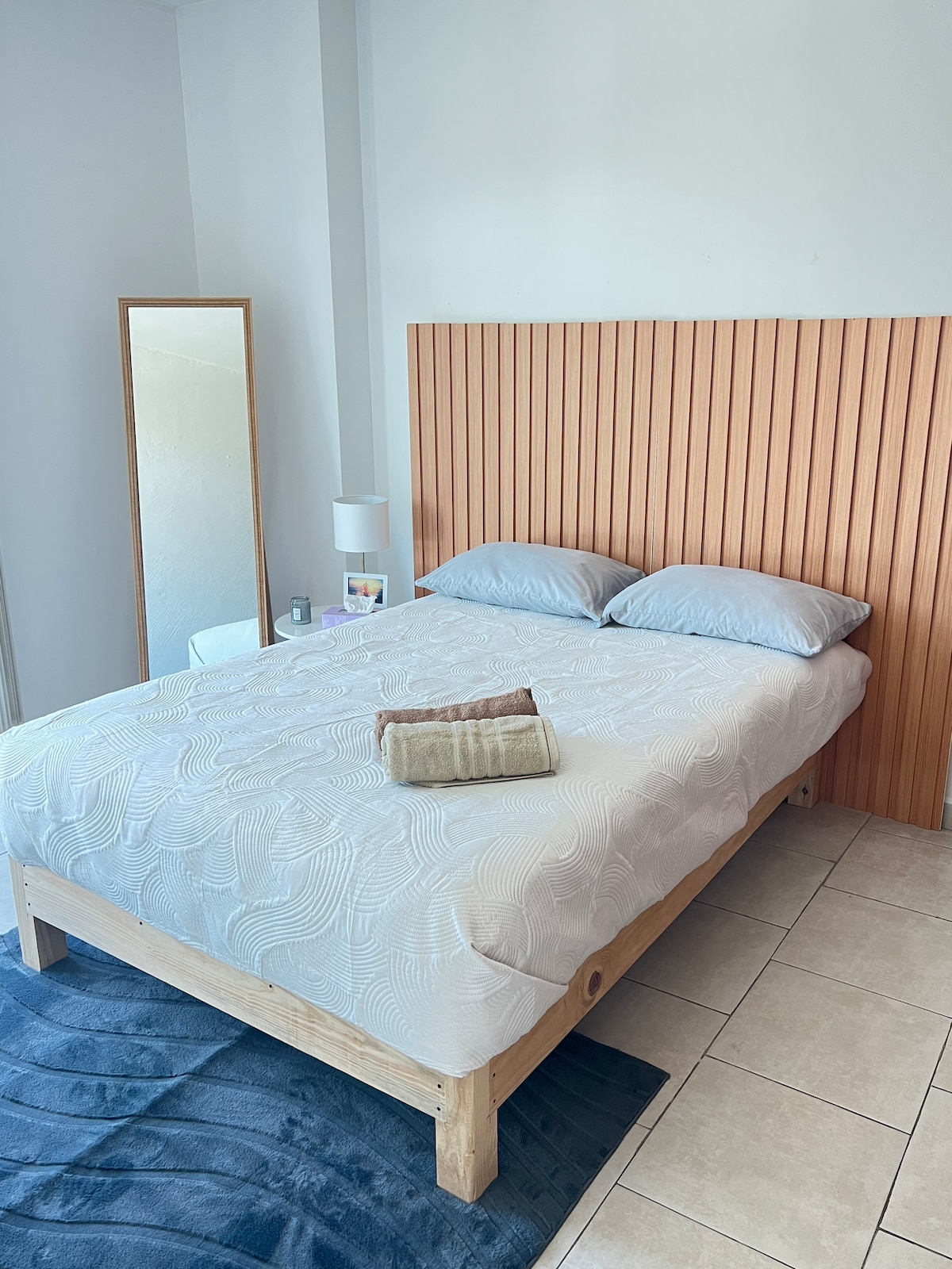 Departamento espacioso minimalista (decorado recientemente). Cuenta con sala y comedor totalmente amueblados, sala de TV con pantalla de 32", cocina integral con refrigerador y microondas, 2 baños completos con amenidades, 2 recamaras totalmente amuebladas, la principal con baño completo, pisos de madera, closets de pared y adicionalmente un sofá cama tamaño matrimonial. Cuenta con 1 cajón de estacionamiento dentro del conjunto y con vigilancia las 24 hrs, Internet de alta velocidad y Netflix.