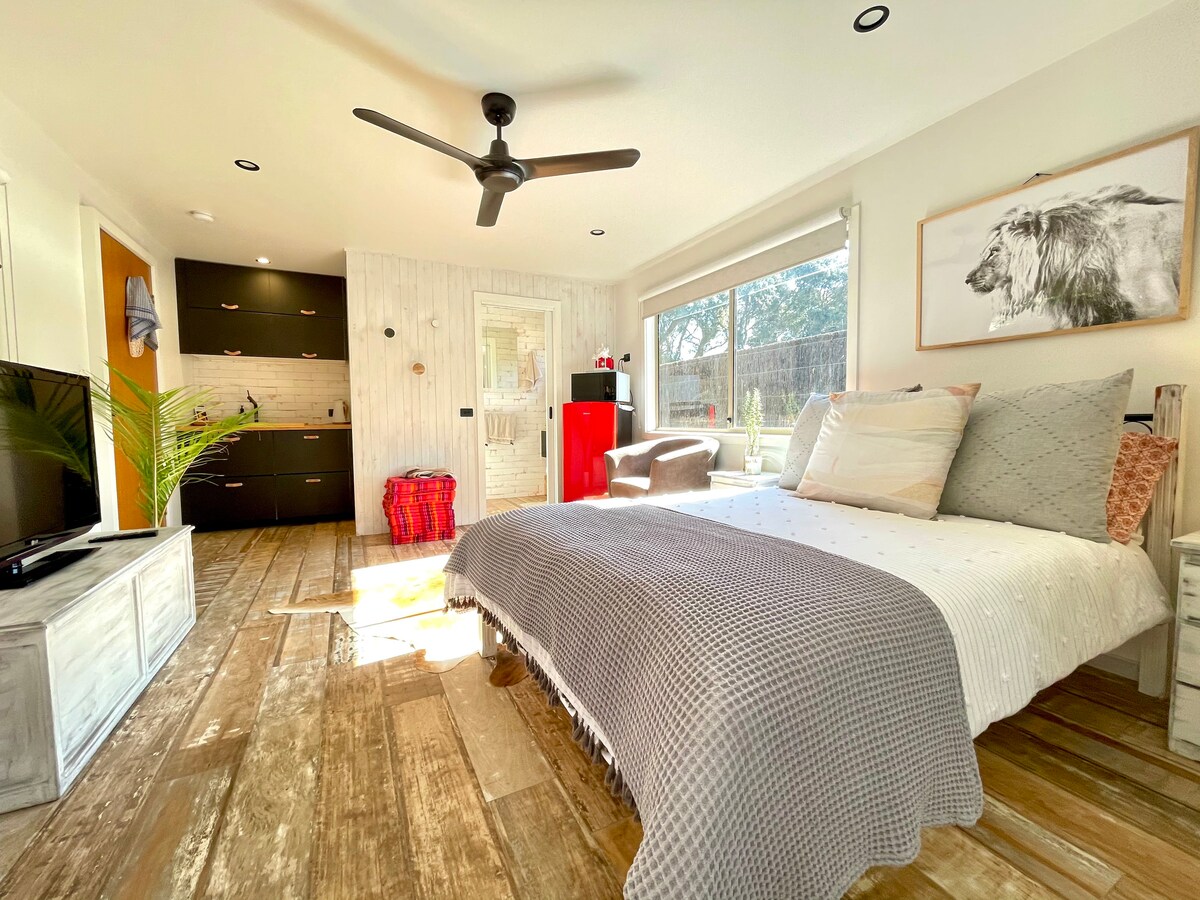 Este apartamento privado para huéspedes está rodeado de árboles nativos de moonah en un barrio encantador y tranquilo. Decorado con estilo, cuidadosamente diseñado y a solo 800 metros de la popular playa de Tyrone. Disfruta del espacio interior lleno de luz pero privado, que está bien equipado pero compacto y con una agradable sensación de frescura. Relájate en el elegante espacio exterior cubierto, similar a un centro vacacional, que ha sido un gran éxito entre los huéspedes. Muy adecuado para personas solas o parejas románticas, ven y recarga las pilas.