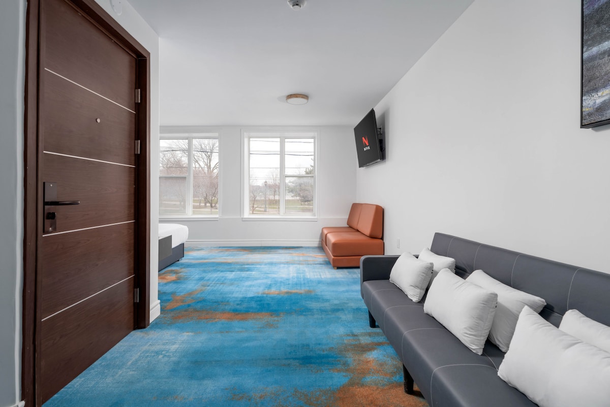 Bright studio with a King bed and large street-facing windows offering great natural light. Next door to Danforth Music Hall and steps from the restaurants, cafés, bars, and shops of Greektown. Broadview subway station is just a 200-metre walk away for easy TTC access across Toronto. Suite #1 at Danforth Hotel includes self check-in, A/C, fast Wi-Fi, a 55” Samsung Smart TV with streaming apps, and a well-equipped kitchenette.