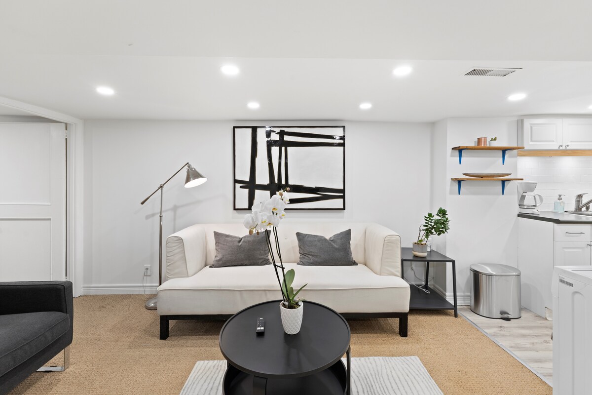 Disfruta de tu estancia en esta suite de nivel inferior totalmente renovada y moderna ubicada en el corazón de Central Etobicoke. Características: Entrada privada Dormitorio grande y luminoso con una cama tamaño queen y sábanas frescas, mucho espacio en el armario. Sala de estar luminosa con TV inteligente, Cocina elegante y totalmente equipada con nevera, fogones, microondas, cafetera y artículos esenciales Baño contemporáneo + tocador Lavadora y secadora en la suite Aparcamiento gratuito y cargador Tesla en el sitio Wifi de alta velocidad. Acceso al patio trasero/barbacoa.