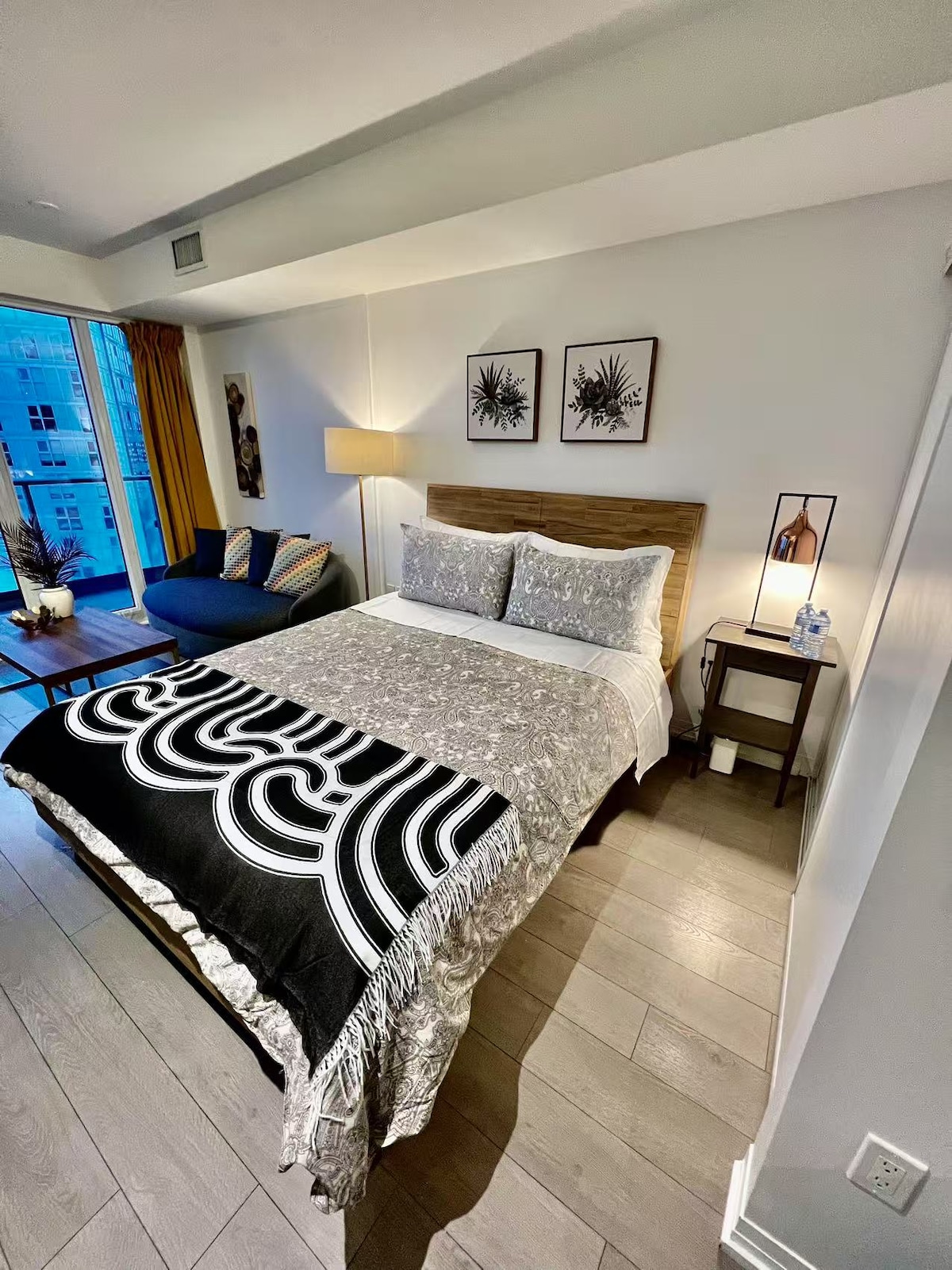 Alójate en el corazón del centro de Toronto en este luminoso y moderno estudio con vistas al horizonte. Disfruta de una cómoda cama tamaño queen, una cocina totalmente equipada y un espacio relajante diseñado para la comodidad y el estilo. A pocos minutos del Eaton Centre, de restaurantes y de lugares de ocio, es el punto de partida ideal para el trabajo o el placer.