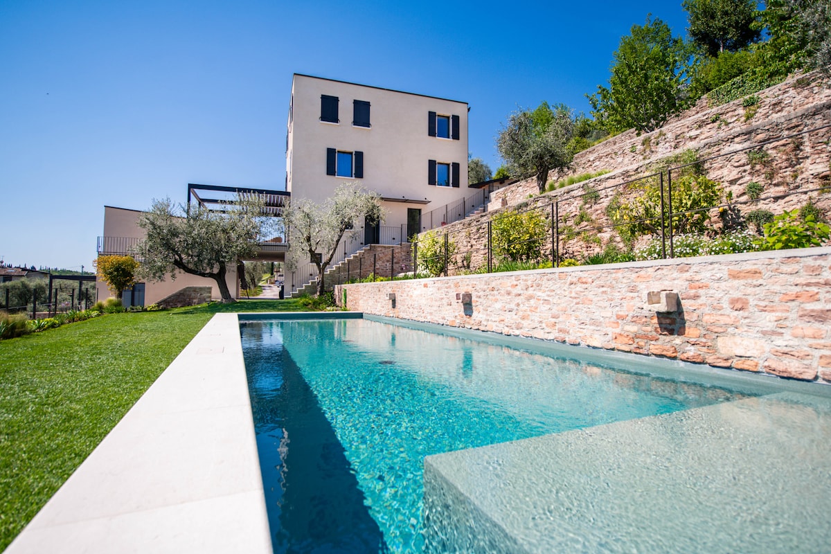Ca’ del Buso is a 15th-century residence among the hills of Valpolicella. Immersed in silence, it welcomes you with a delightful panorama where the gaze stretches over vineyards, cherry trees, and centuries-old olive trees: the ideal place to rejuvenate body and soul. Restored in 2011, the property offers two homes with modern and refined design. Here, designer furnishings create a noble contrast with the ancient stones, offering you a unique stay between historical charm and elite comfort.