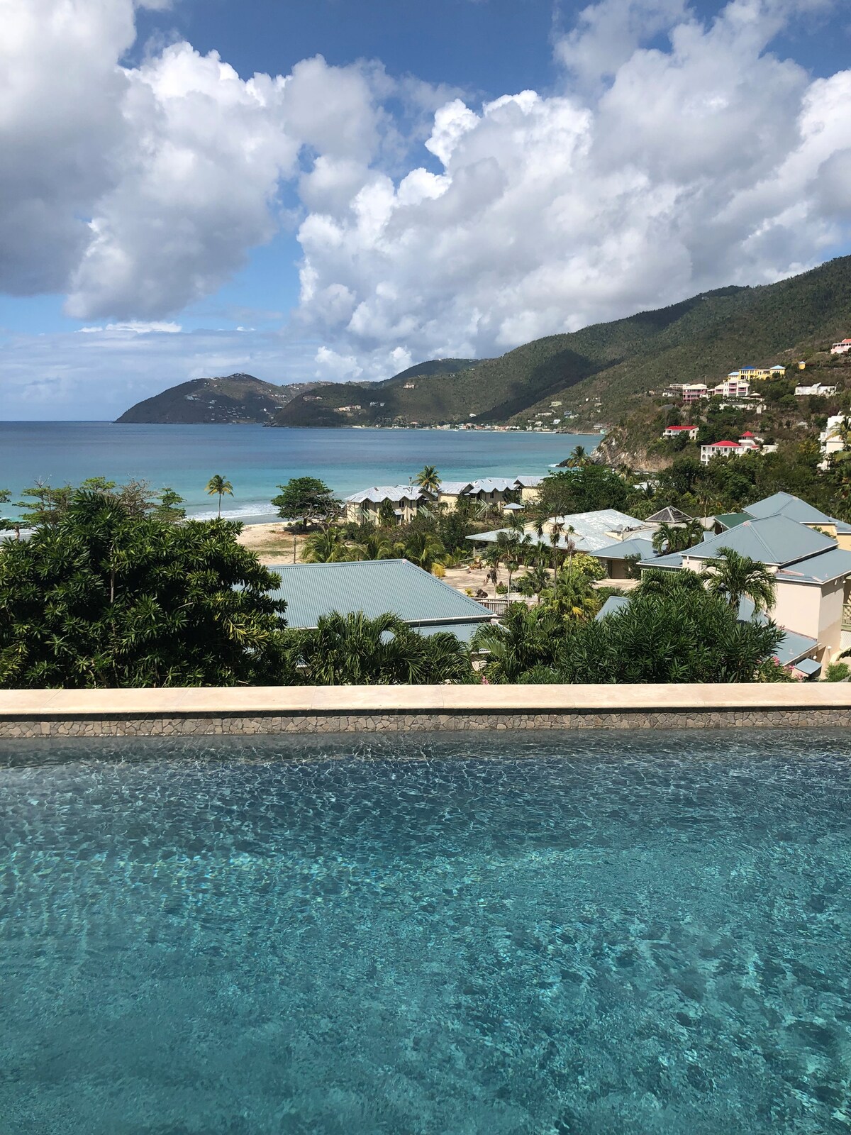 Vista do Mar La suite Seaview en nuestra villa junto a la montaña, Vista do Mar, en un exuberante paisaje tropical, ofrece unas vistas impresionantes al océano y a la playa desde la sala de estar, la terraza, el balcón y los dormitorios. La villa está a 150 metros con vistas a la playa más larga de las Islas Vírgenes Británicas, cerca de restaurantes y bares. Las parejas, los recién casados y las familias (con niños) han dormido al son del surf oceánico con la fresca brisa de Vista do Mar. La piscina es ideal para los niños o para refrescarse después de un día de playa.