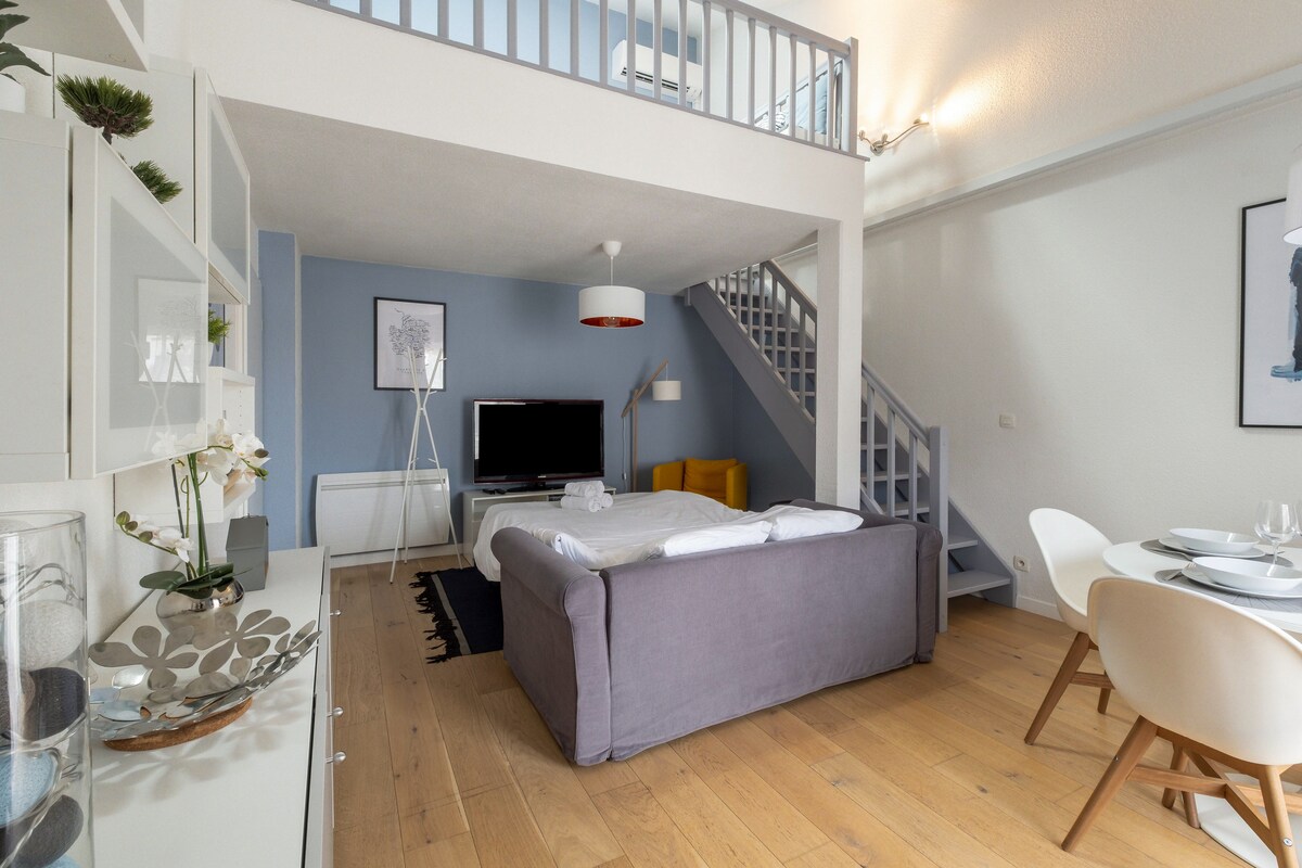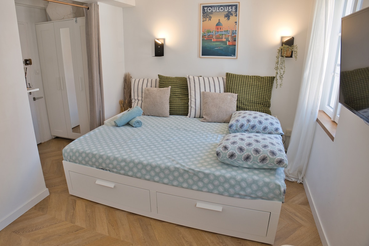 Regálese un descanso de bienestar en el corazón de Les Carmes. Este elegante apartamento, frente a la iglesia de la Dalbade, le da la bienvenida para una estancia romántica o relajante. Disfrute de una bañera de hidromasaje, una cama de alta gama (colchón EMMA160x200) y la tranquilidad excepcional del centro histórico. Ideal para desconectar, a dos pasos de las mejores direcciones de Toulouse.