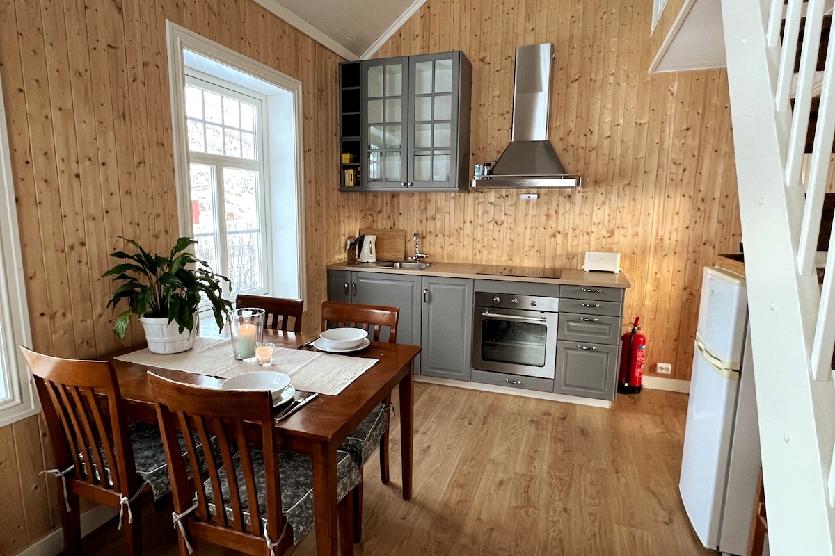 El apartamento comprende toda la planta baja de una pequeña granja y tiene un dormitorio principal con baño privado, una sala de estar (funciona como un segundo dormitorio cuando hay más de dos huéspedes), una cocina y un segundo baño. Los alrededores son tranquilos y puedes aparcar justo fuera de la puerta. En ciertas épocas del año, es posible que veas alces o grullas. En verano, las vacas pastan en los campos cercanos; el granero tradicional es ahora un centro cultural, dirigido por Fjøsakademiet.
