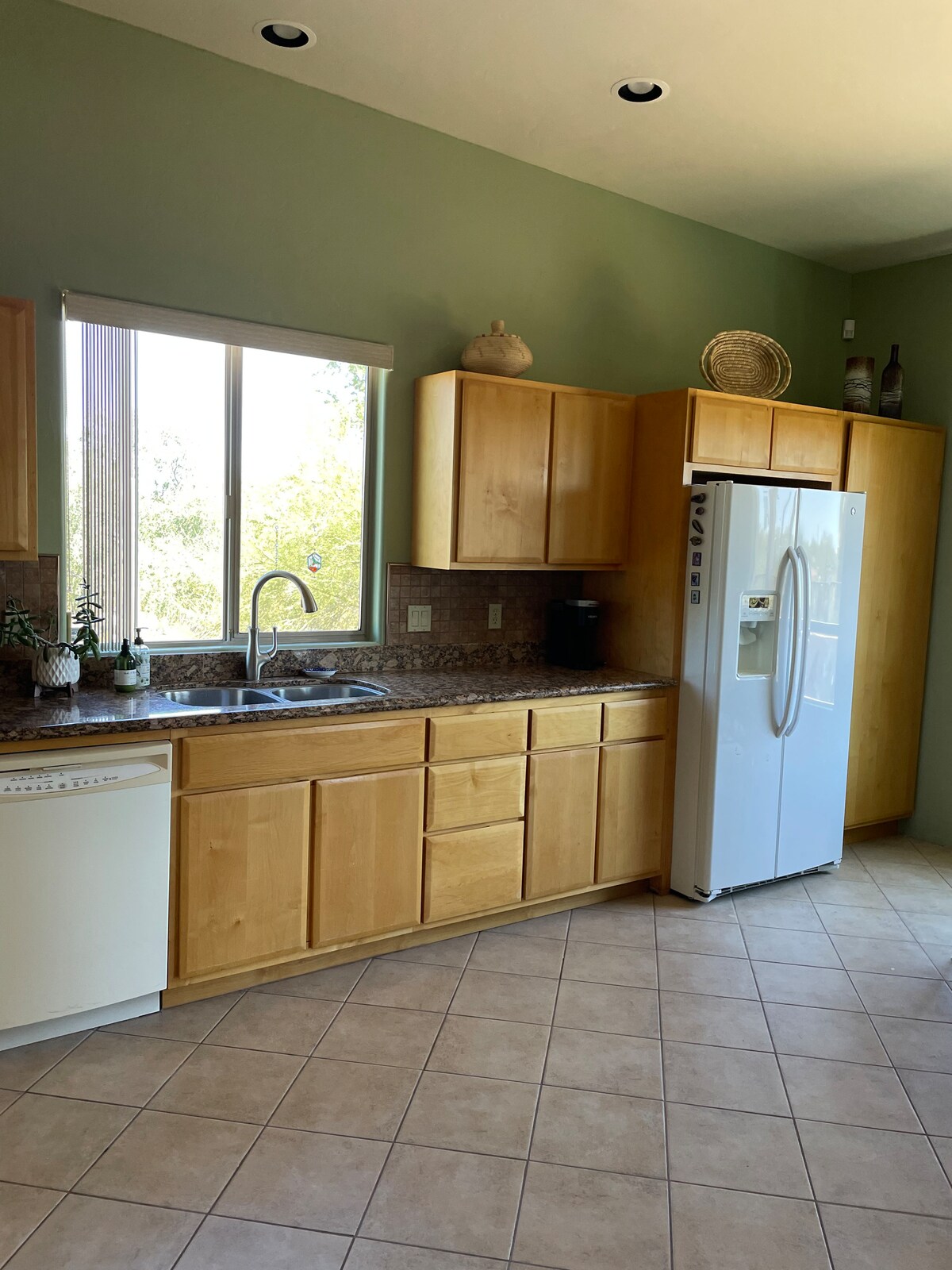 This is a lovely (single-family residential use) home that is located next to other homes in track-style development. The home has 10-foot ceilings. The floor plan of the house is open and roomy. The home's flooring is part ceramic tile with carpet in the bedrooms. We are located on a dead-end street. No thru traffic. The backyard faces an open common area desert. Sometimes you will see coyotes, javelinas, and roadrunners. You will see lots of birds, rabbits, and quail.