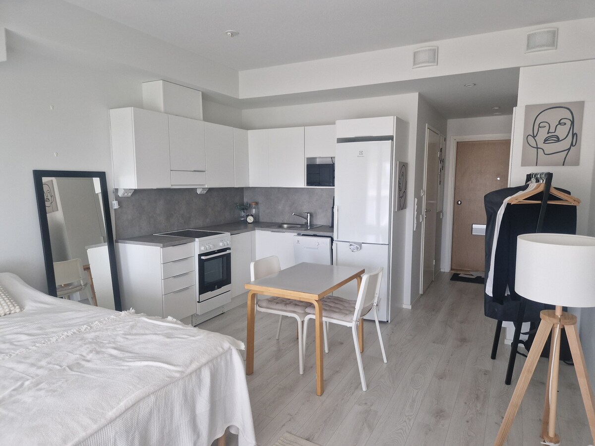 Cerca de la zona del castillo de Turku llamada "Linnanfaltti" tengo este apartamento de 38 m3. El apartamento cuenta con todo lo necesario para una visita corta o una estancia más larga, una cocina totalmente equipada, baño,dormitorio/sala de estar. El acceso inalámbrico a internet te mantendrá conectado durante tu viaje. Desde el aeropuerto puedes tomar el autobús n .º 1. Te llevará al lado del edificio de departamentos. A solo 200 metros a pie de la parada de autobús "Veistämöntori" Los autobuses salen del aeropuerto cada 15 minutos y tomará unos 35 minutos.