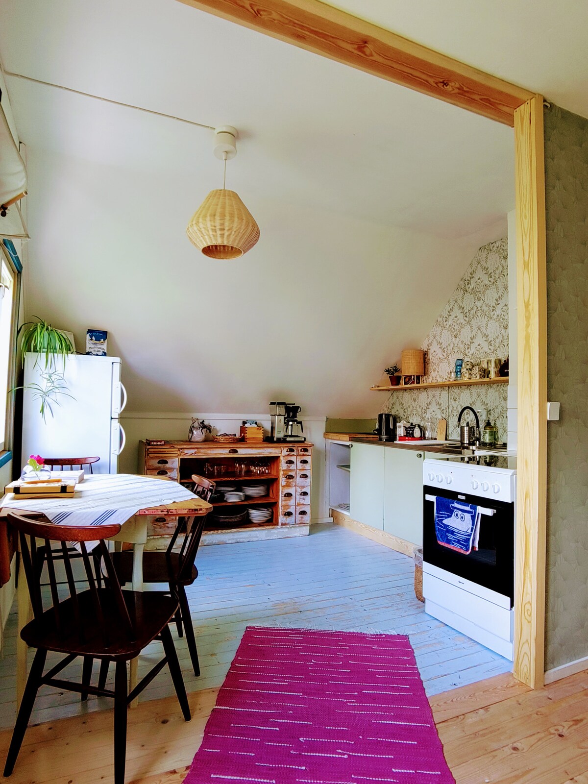 Pequeña casa idílica en una casa de madera de 100 años de antigüedad, cerca de TYKS-hospital, la Universidad Turku, la Universidad de Ciencias Aplicadas de Turku y la estación de Kupittaa. Esta casa de Airbnb está decorada y renovada con un espíritu ecológico y de reciclaje. La pared enyesada de arcilla, el piso a cuadros, los azulejos de pared hechos a mano, los colores cálidos, el papel pintado de William Morris y una vieja estufa de leña crean un ambiente que seguramente sentirás cuando entres. Estaciona tu auto frente a la casa, las paradas de autobús al centro justo al lado de la casa.