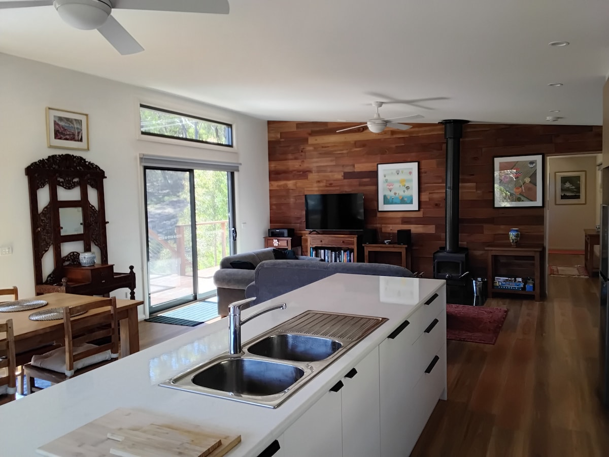 Una propiedad limpia, elegante y espaciosa que admite mascotas ubicada a solo 5 minutos en coche de la Princess Highway en una pintoresca propiedad de 7 acres de eucaliptos azules. La casa de campo ofrece mucho espacio para la familia con una sala de estar de planta abierta, comedor y salón con una acogedora chimenea de leña y ventiladores de techo. Disfruta sentado en la zona de la terraza privada contemplando la serenidad, disfrutando de la vida de las aves locales o relajándote alrededor de la hoguera.