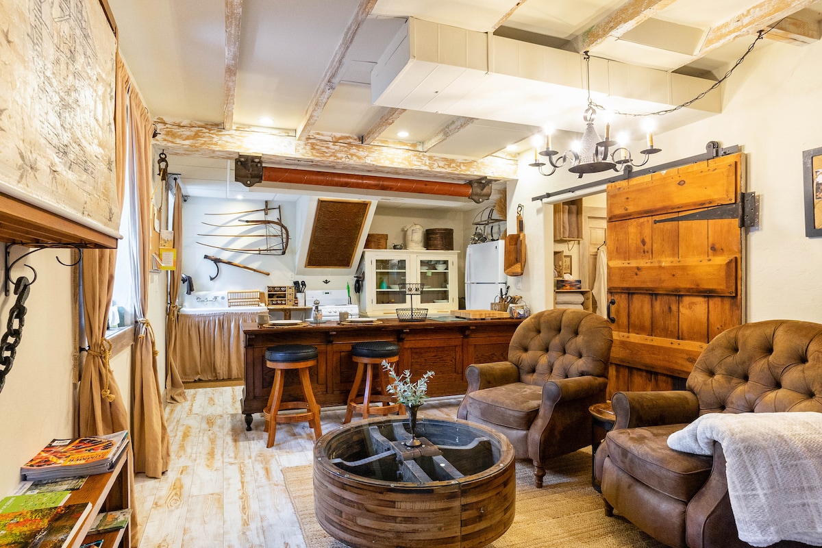 Descripción del anuncio * TODO INCLUIDO * (con variaciones estacionales) Jacuzzi~4 Embarcaciones~Pase de Parque~Bicicletas~Fuego y Ducha al Aire Libre~Huerto Una experiencia única te espera en nuestro molino de piedra caliza de 200 años de antigüedad. Este espacio ecléctico con entrada privada está ubicado entre dos cascadas en una isla en el río Salmon. La suite de 525 pies cuadrados bellamente equipada está justo en el borde del río. Cena y relájate en tu patio privado con vistas a las cascadas y al antiguo puente de un carril.