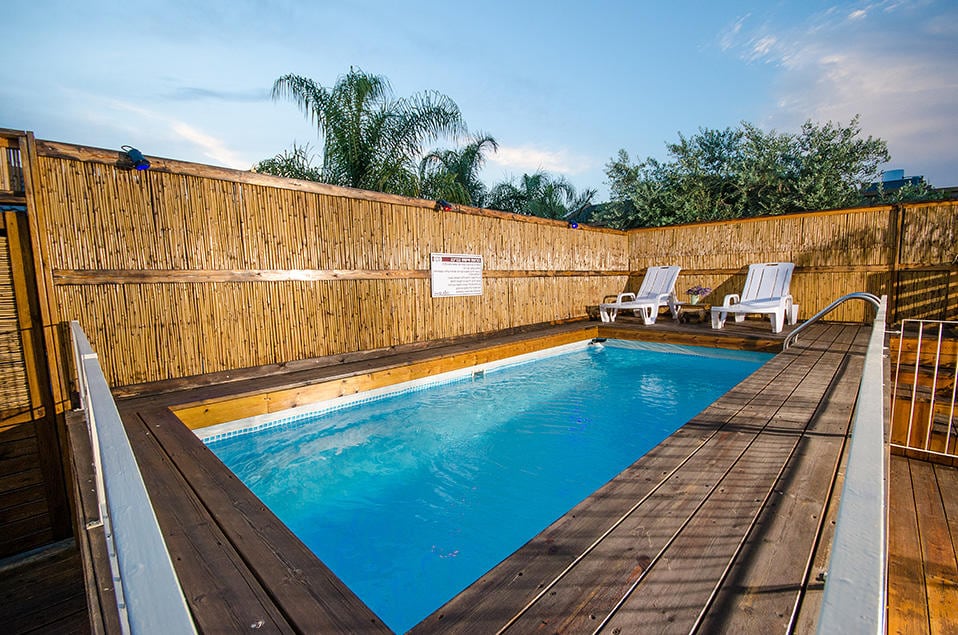 Un poco sobre las cabañas Las dos cabañas gemelas de 'Sulam Yaakov' están escondidas detrás de hermosas vallas de bambú no muy lejos de la casa de huéspedes en el barrio de extensión del Moshav. Más allá de la puerta, se revela un complejo completamente privado, rodeado por todos lados por bambú, cuyos dos elementos prominentes son una piscina elevada y una cabaña de madera.