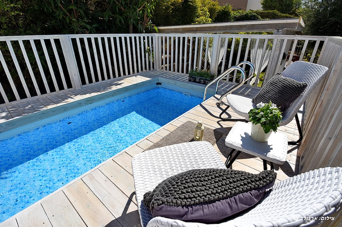 Este espacio amplio y tranquilo se olvidará de cualquier duda. Una gran cabaña de madera romántica con patio privado, árboles ,flores y mucha tranquilidad. En cabaña de dormitorio independiente con cama doble, Amplia sala con sofá cama para una cama doble, Smart TV TV TV, ventana de patio, Leer libros, juegos y manualidades . Una cocina totalmente equipada en un refrigerador grande,horno , hervidor eléctrico y cafetera exprés. Porche delantero con vistas a la montaña y al mar de Galilea. Jardín trasero con piscina para remar, jacuzzi , sala de estar y tumbonas.