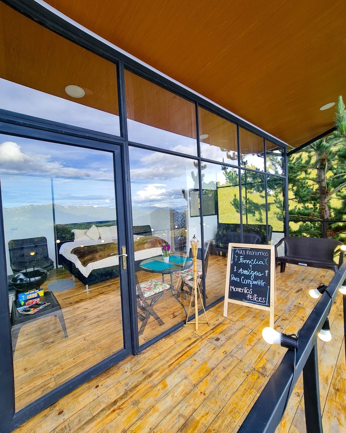 Esta cabaña esta construida en su totalidad en madera con un diseño único que busca máximizar la experiencia campestre, tranquila, descomplicada y romántica. En el primer nivel encontrarás tres módulos independientes, en el primero la cocina, la mesa de comedor y sofa cama con una puerta que abre de par en par hacía la majestuosidad de la cordillera orienta. En el segundo un baño y en el tercero la habitación. Subiendo las escaleras encontrarás una imponente terraza de 30 m2 con la mejor vista!