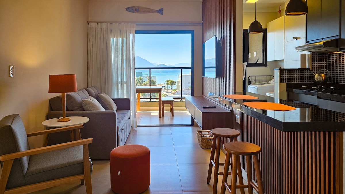 Apartamento nuevo/reformado, con increíbles vistas al mar en la mejor ubicación de Ubatuba. Cerca de todo y al mismo tiempo en medio de la naturaleza. 1 dormitorio con cama doble y vistas al mar Habitación integrada con cocina Piscina en el condominio. Aire acondicionado Wifi rápido de 200 Mb Cochera Recepción 24/7 Se encuentra en Prainha do Matarazzo y a 5 minutos de Praia do Perequê-Açu. Moderno y con vistas al paraíso. Debido a que estamos cerca de Café de La Musique, puede haber ruido los fines de semana.